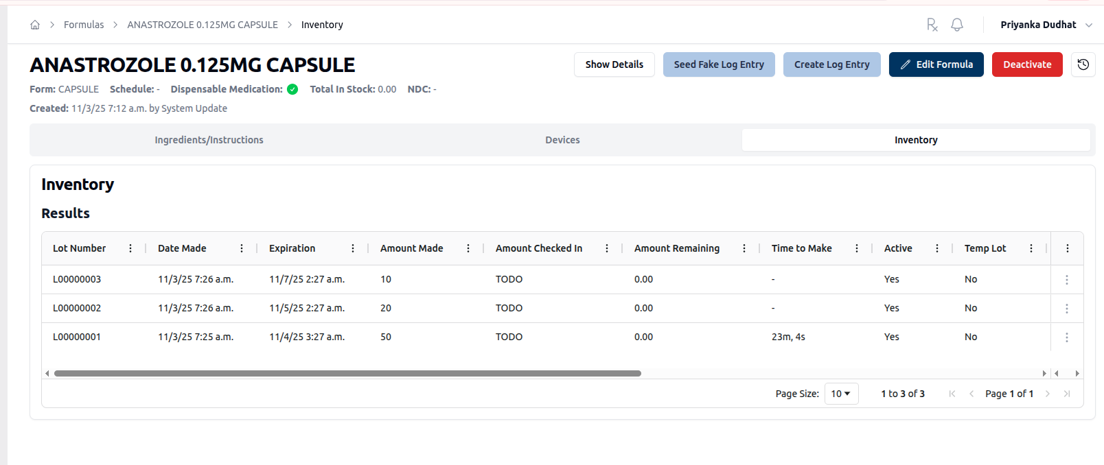 Fixed date and time formatting for Formula Inventory including Date Made, Expiration, and Time to Make fields