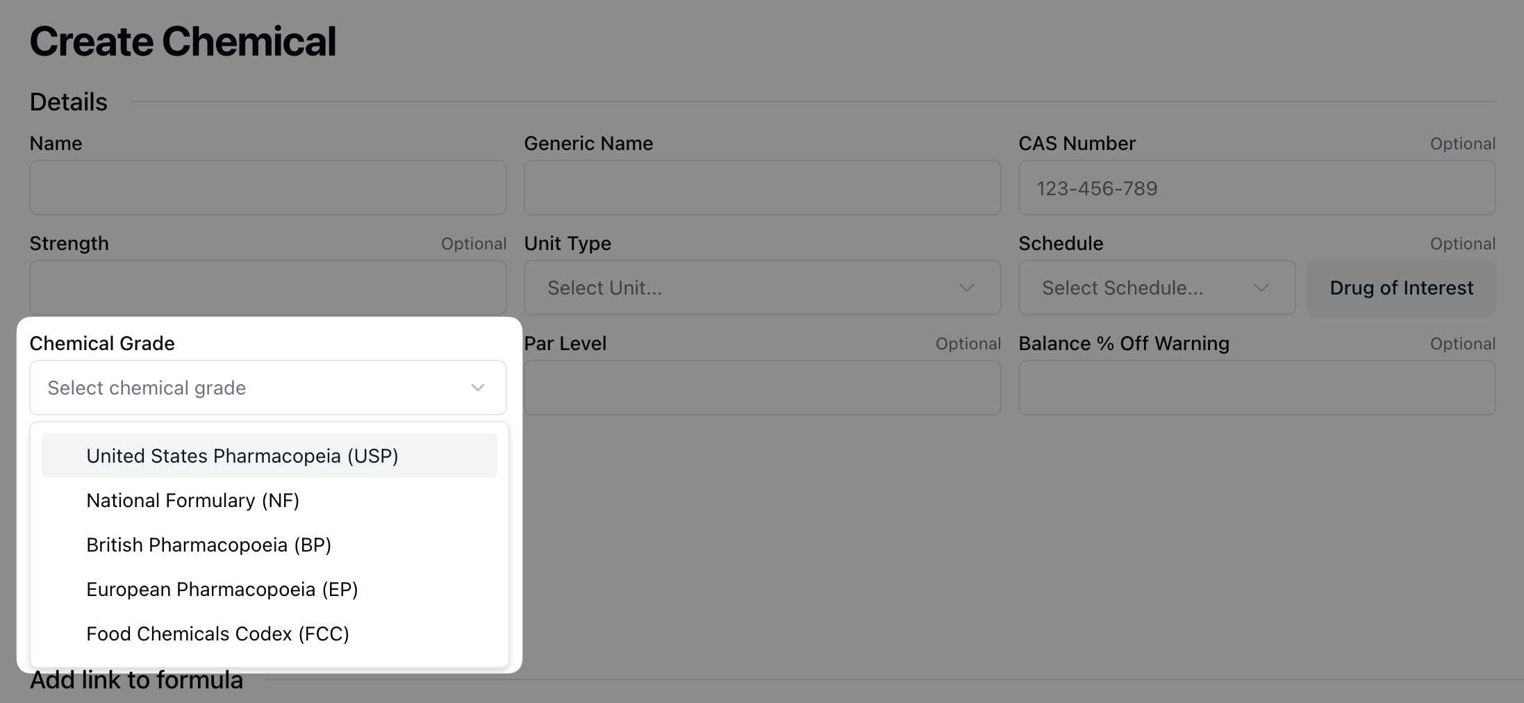 Revised chemical grade inputs into a select method so only one option can be selected, such as USP, NF, or BP.