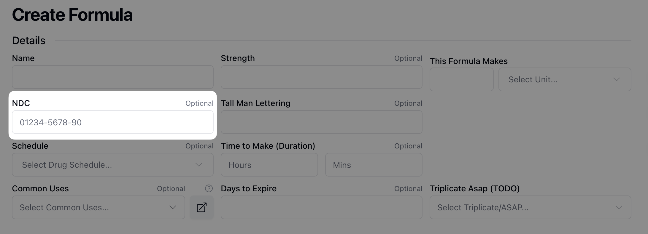 Added an NDC field for formulas, including a validation check to ensure consistency in formatting.