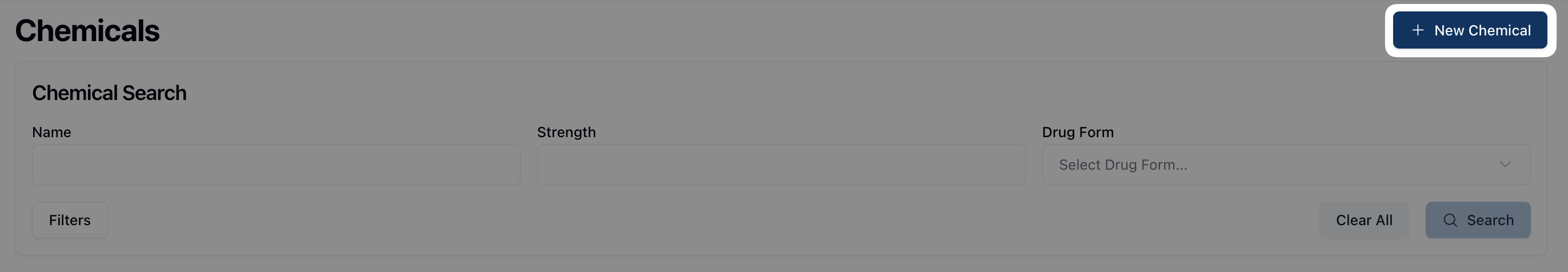 To add a new chemical, navigate to Chemicals and click the + New Chemical button in the upper right corner of the page. This opens the Create Chemical form.