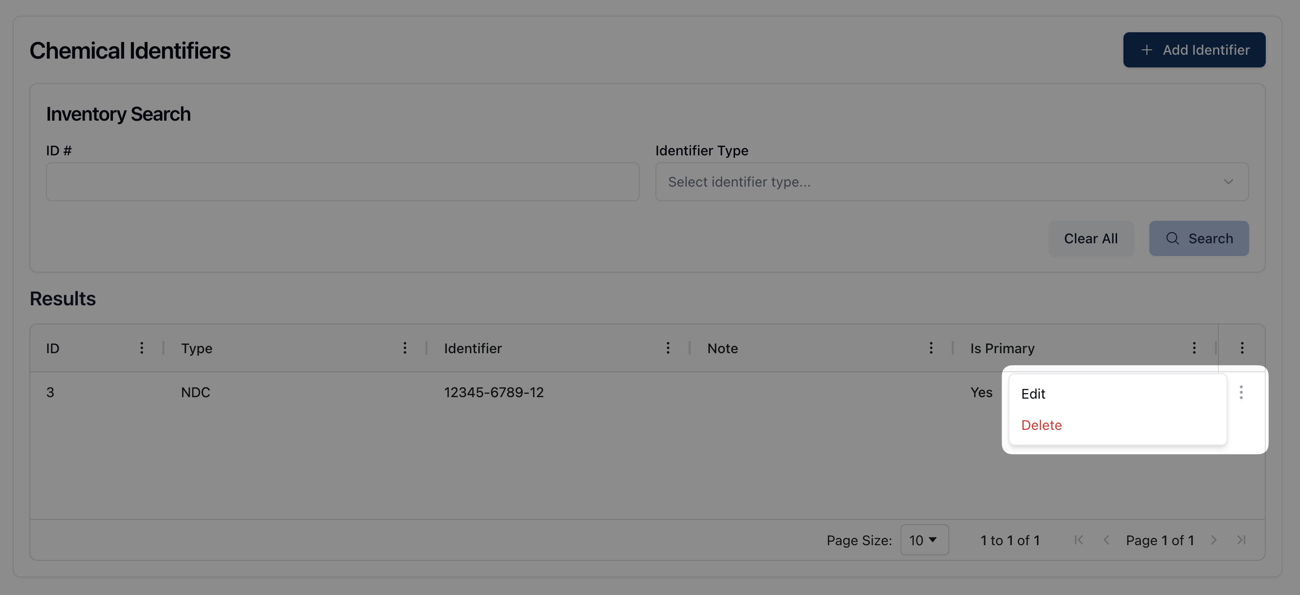 To open the actions menu for any of the chemical identifiers, click the three dots ( ⠇) to the right of the table item. Once open, this menu allows you to Edit or Delete the identifier.