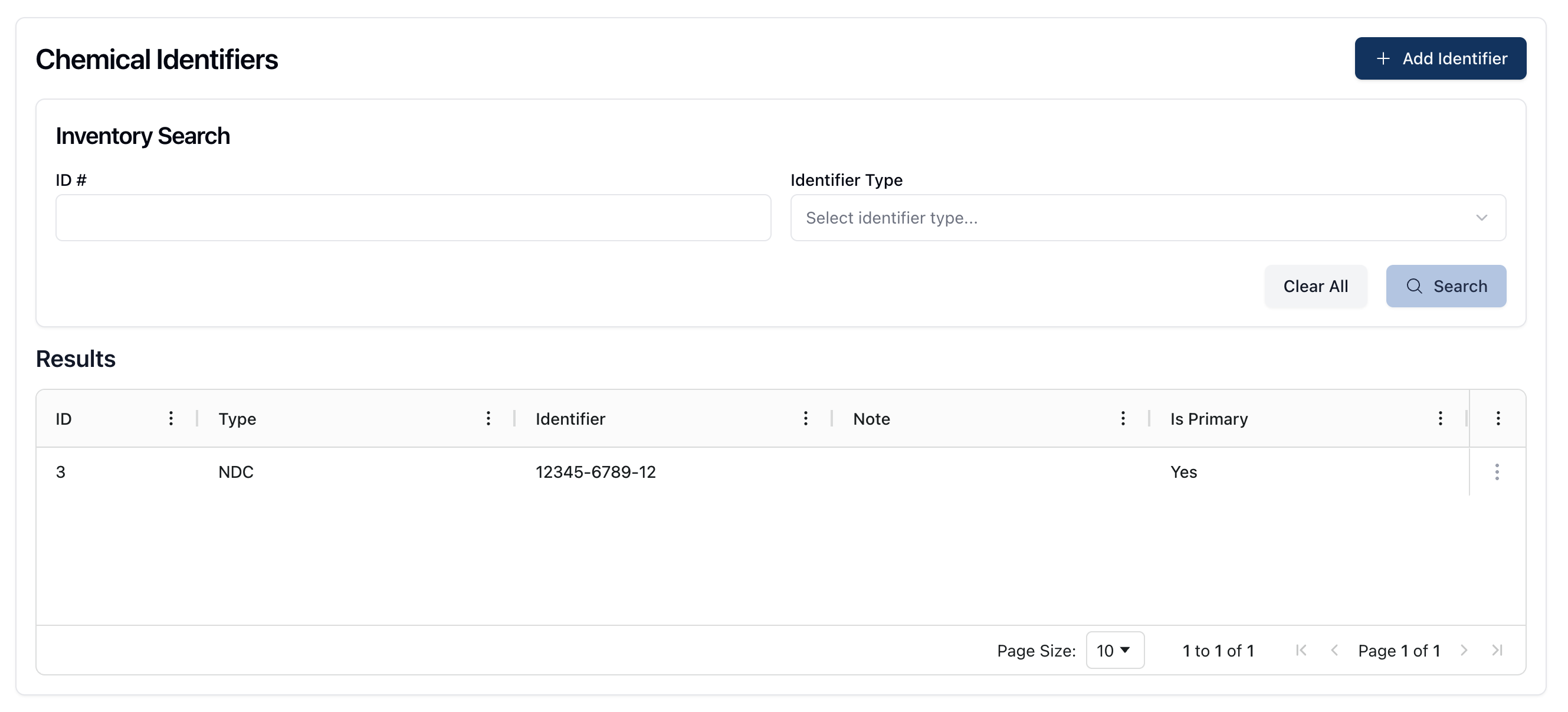The Chemical Identifiers tab includes both a search area to search or filter any identifiers added to the chemical record and a results area to view a table-based list of related identifiers. To filter the search results, you can search via the chemical identifier's ID # or the Identifier Type, such as NPC or UPC.