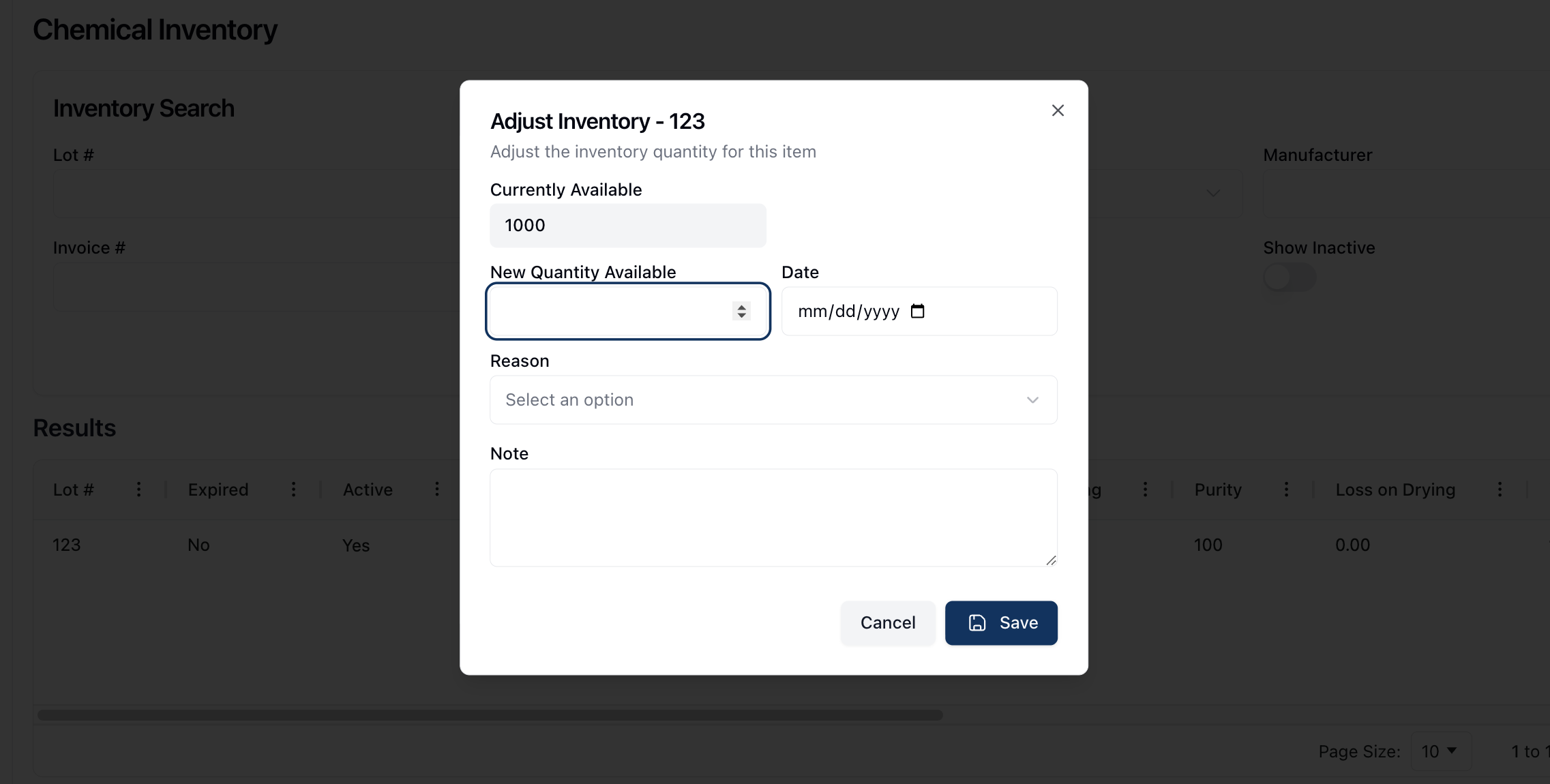 Once all of the fields are complete, click Save to adjust the chemical inventory.
