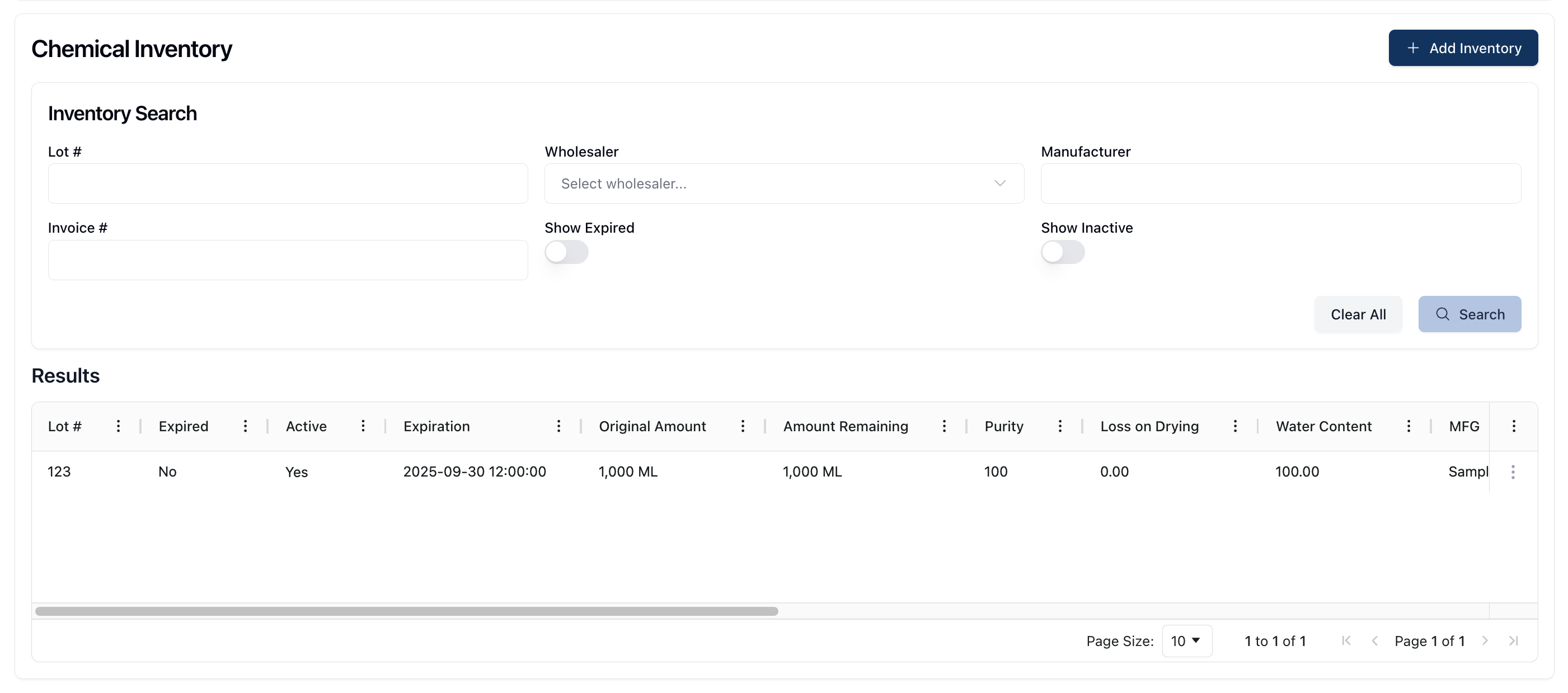 Show Expired | Toggling this option on displays expired inventory related to this chemical. |