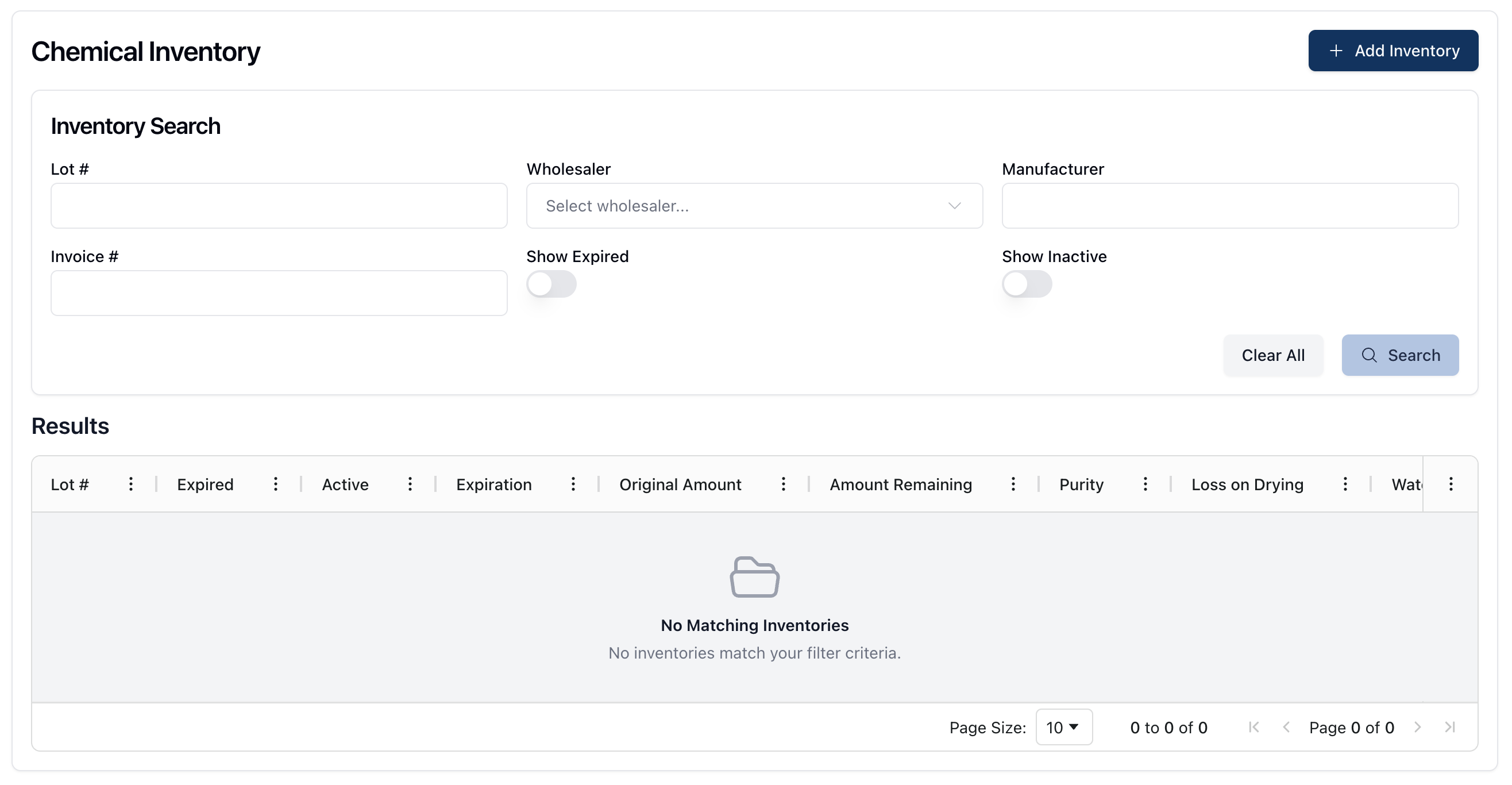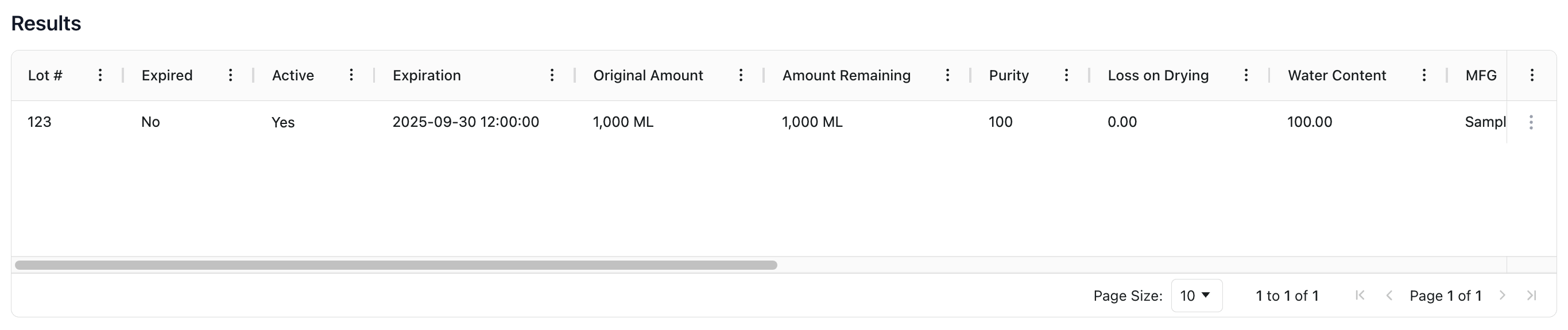 The Results table displays all inventory related to the chemical record and includes the following information: