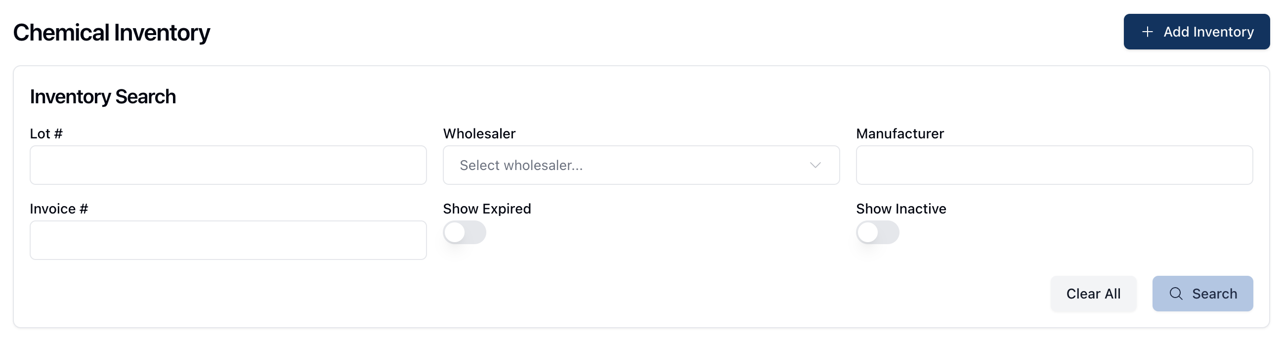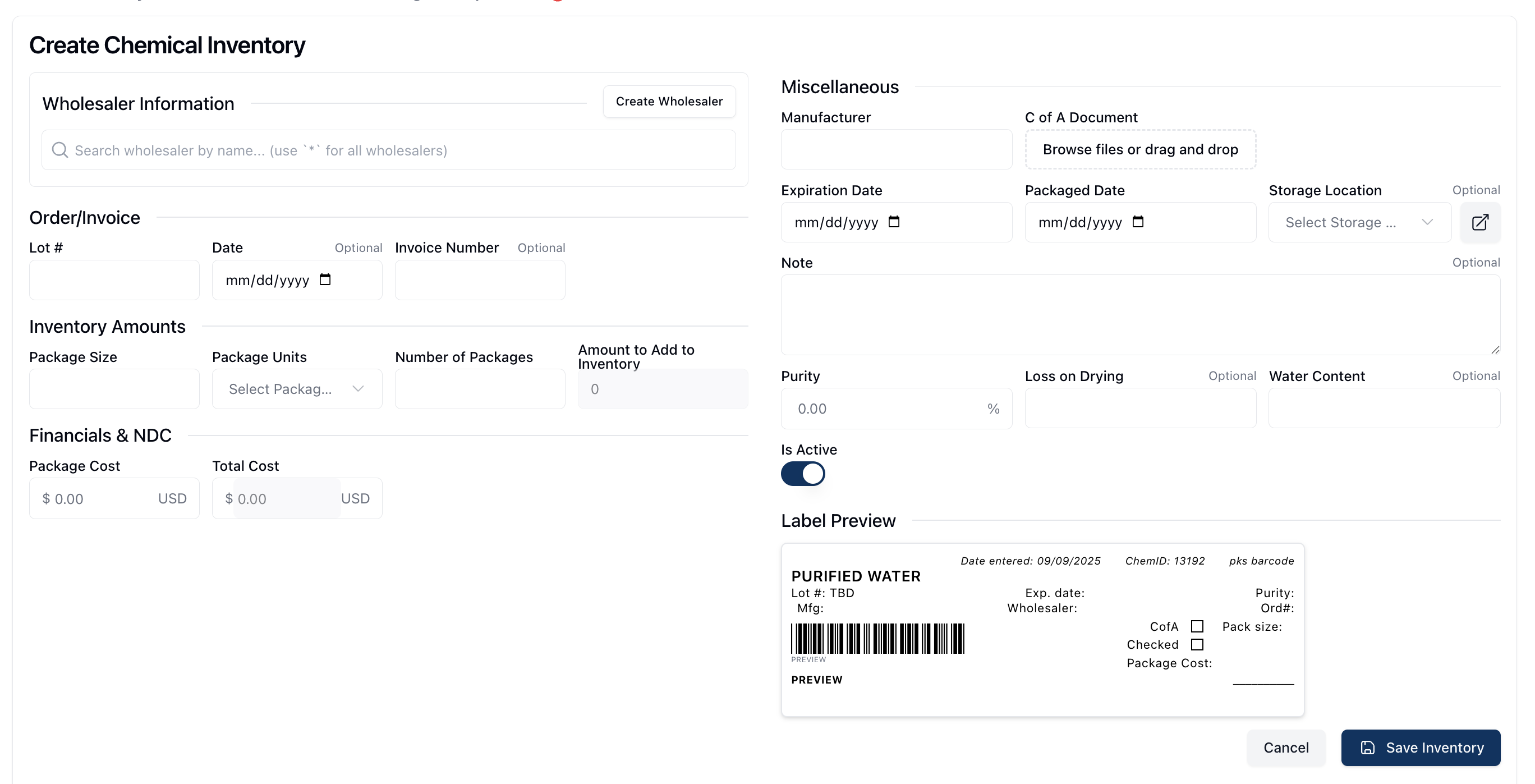 To add chemical inventory, click the + Add Inventory button in the upper right corner of the page. This will open a blank Create Chemical Inventory form.