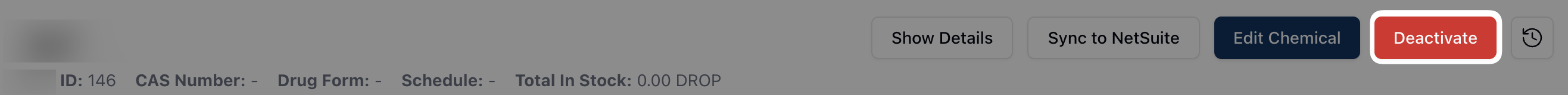 To deactivate a chemical record, click the Deactivate button in the upper right corner of the page. When a chemical is deactivated, the table view on the Chemicals page and the chemical record details indicate that the chemical is inactive.