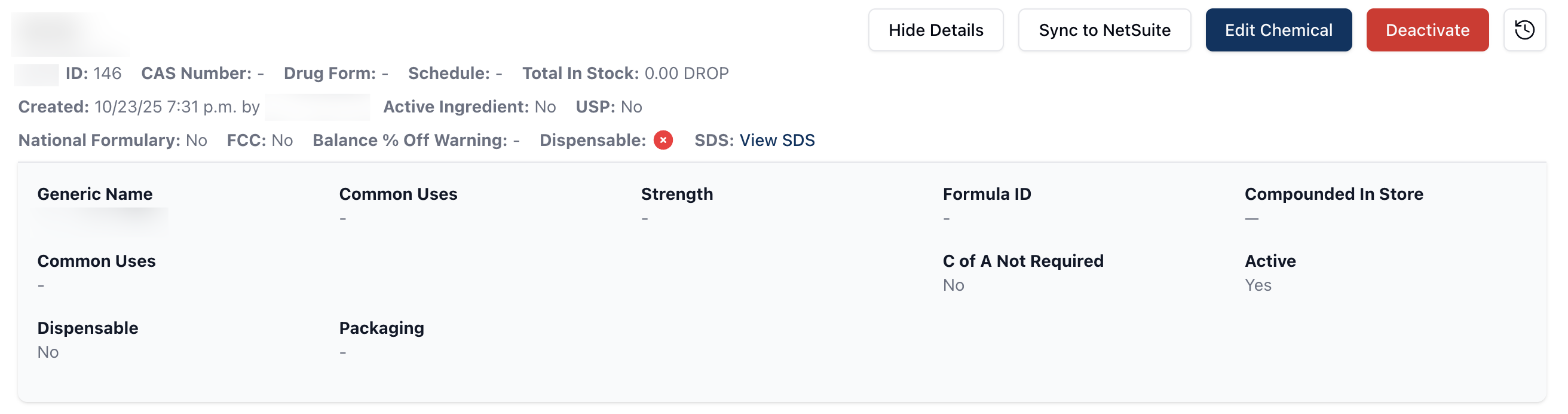 Active | Whether or not the chemical is currently active. (To do: Does this mean active in the system or active to be used in a formula/dispensed?) |