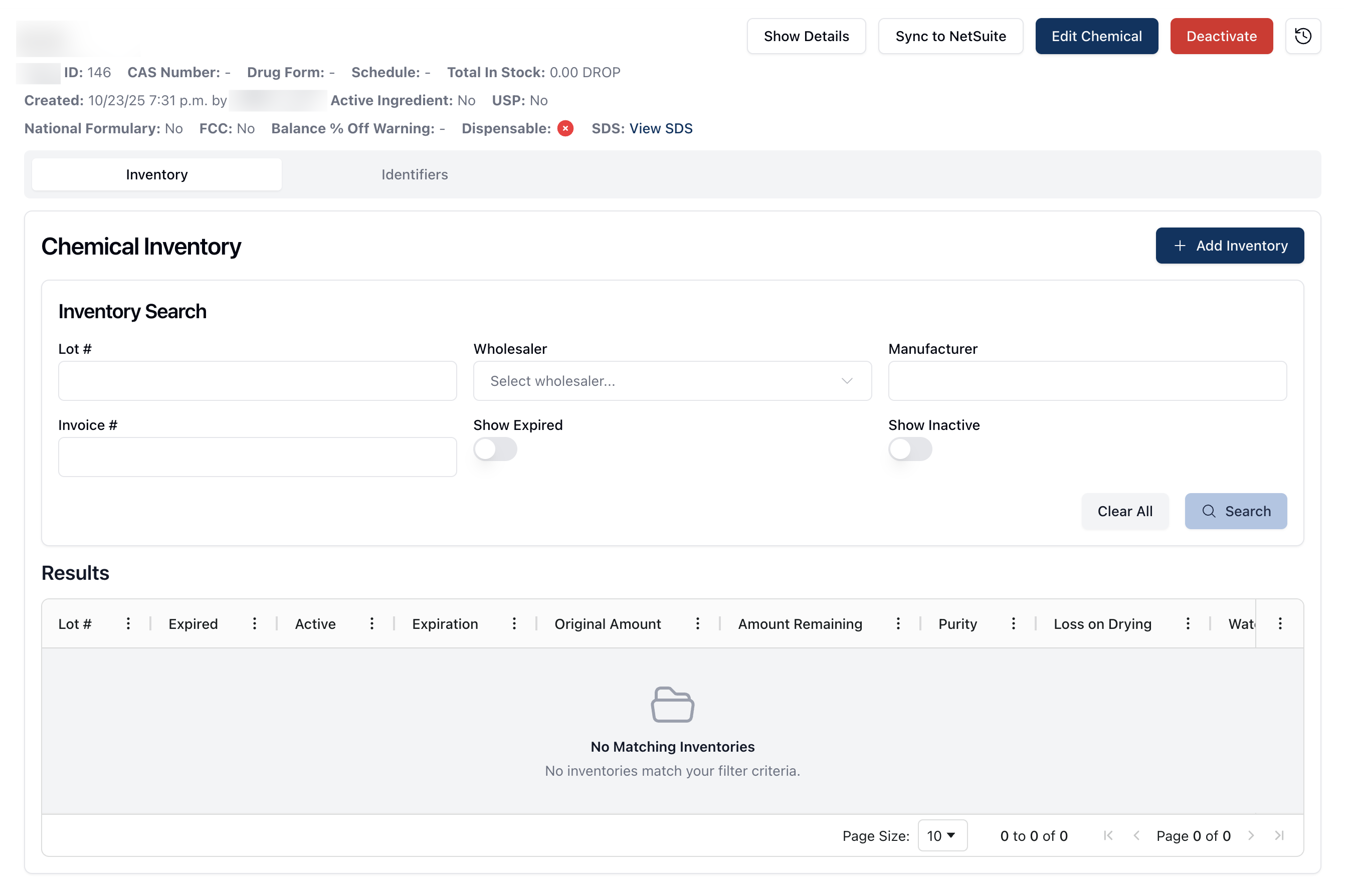 Show Inactive | Toggling this option on displays inactive inventory related to this chemical. |
