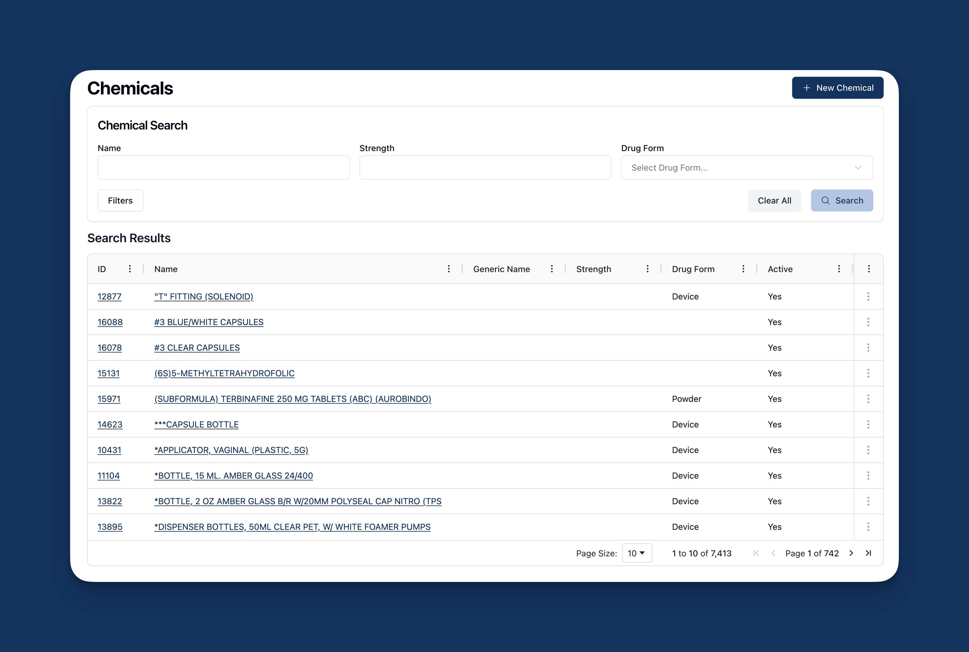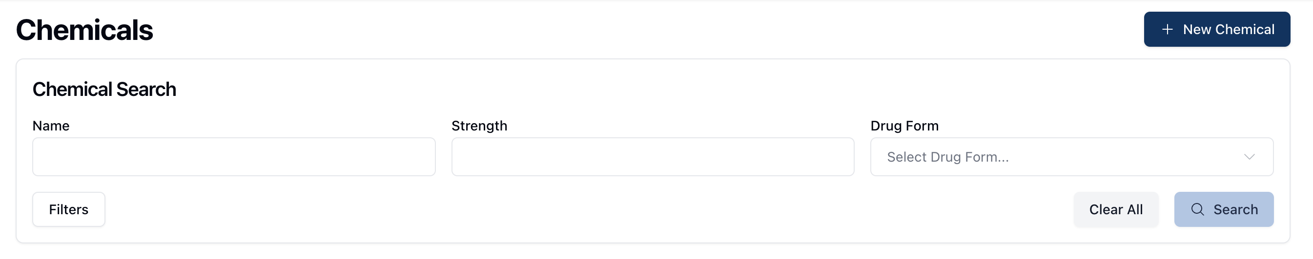 The Chemical Search section offers a handful of fields that allow you to filter which chemicals appear in the results below. These fields include: