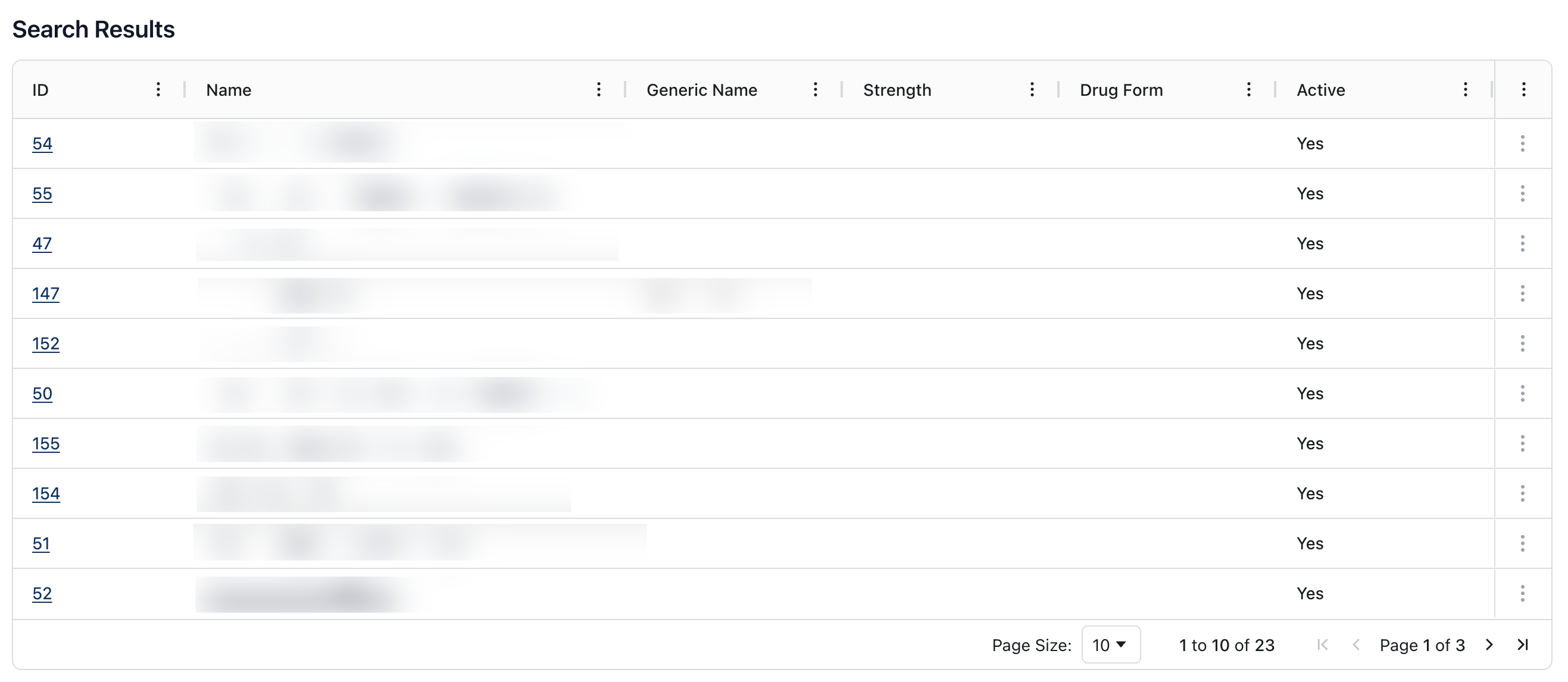 You can sort search results according to the categories listed at the top of the table by clicking on the three dots ( ⠇) to the right of each column title.