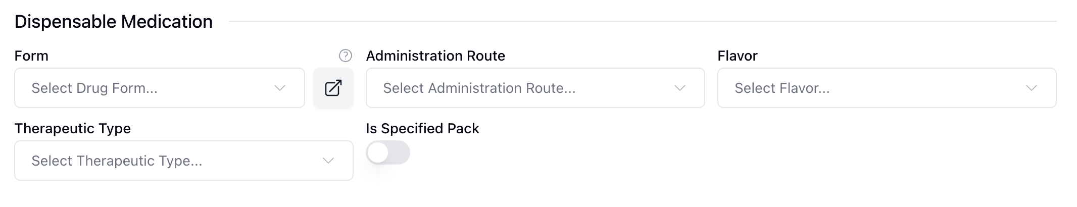 The Settings & Standards section includes a number of toggles that you can turn on when applicable. (To do: How much of this will fall under pharmacy practices vs. what we want to document? For example, do we need detailed information on each setting or would that be more of a pharmacy training/internal practice?) Toggling on Dispensable opens a new set of fields for Dispensable Medication. These fields include: