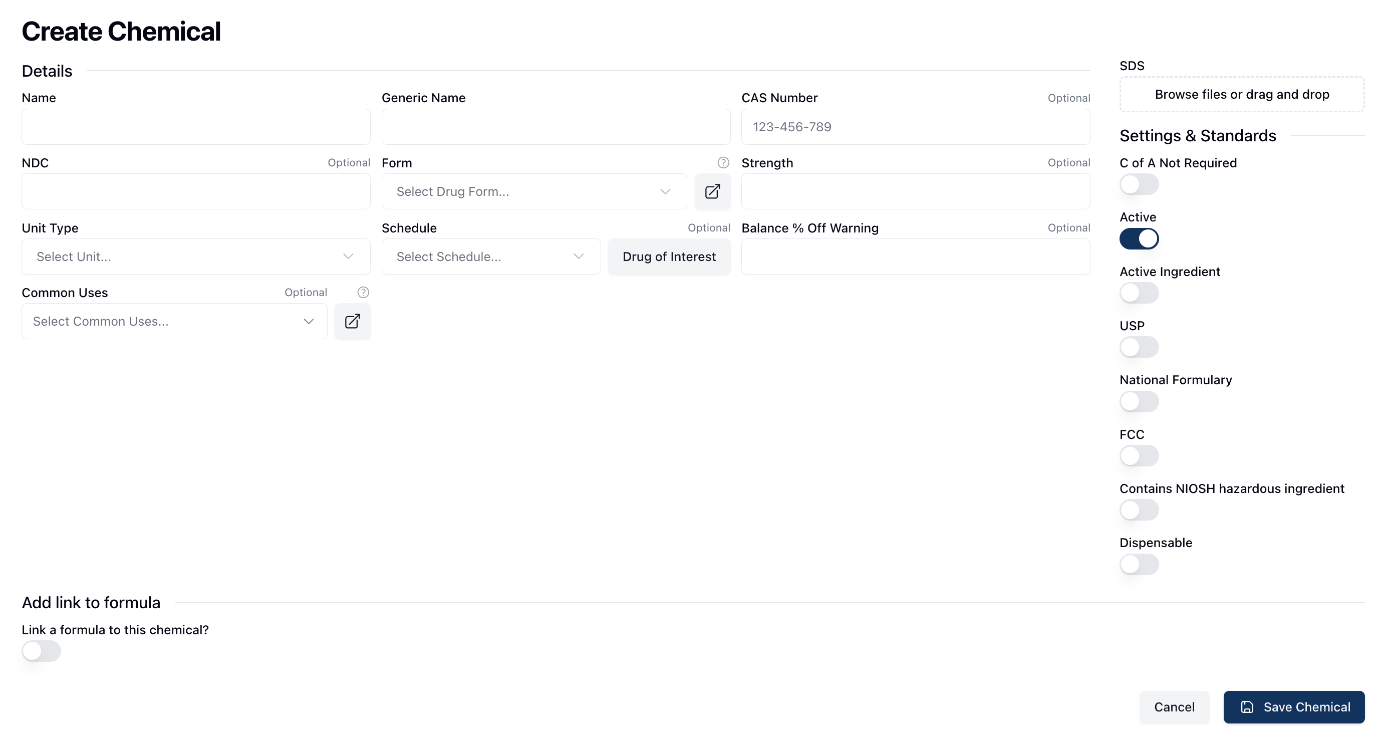 The Create Chemical form includes four distinct sections: Details, SDS, Settings & Standards, and Add Link to Formula.