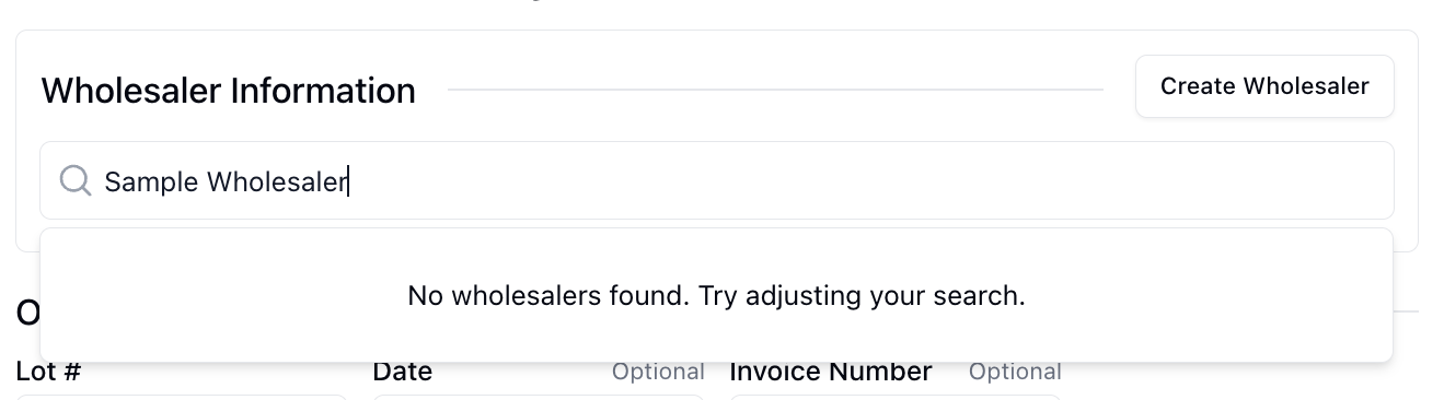 At the top of the form, the Wholesaler Information section includes a search field, allowing you to search the system for existing wholesale providers. If the wholesaler is not yet in the system, click the Create Wholesaler button to open the Creating Wholesaler form.