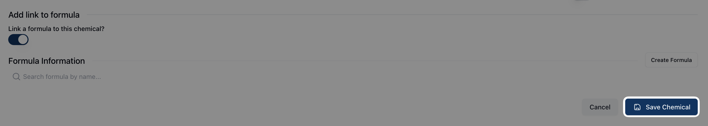 If the chemical is a subformula, or created from a formula via compounding, toggle on Link a formula to this chemical? In the search form that appears, enter the formula name to find and select the relevant formula that creates this chemical. If the formula isn't yet saved in the system, click Create Formula to add it.