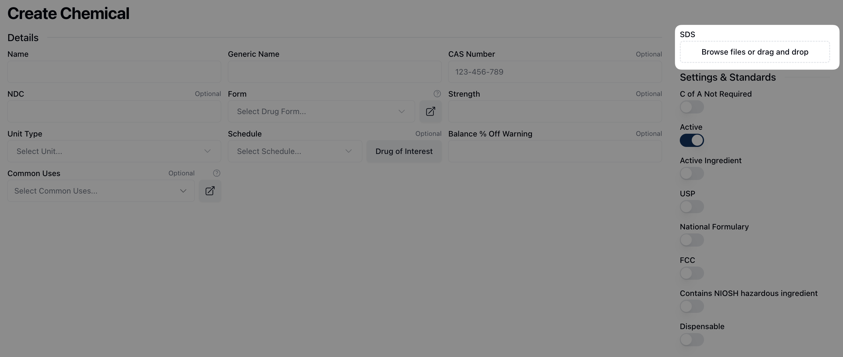 On the page's right sidebar, you can upload any safety data sheets under the SDS field. In the outlined area below SDS, drag and drop any related SDS document(s) to include with the chemical record. Alternatively, clicking directly inside of the field opens a system dialogue, allowing you to search and select any relevant document(s) from your computer.