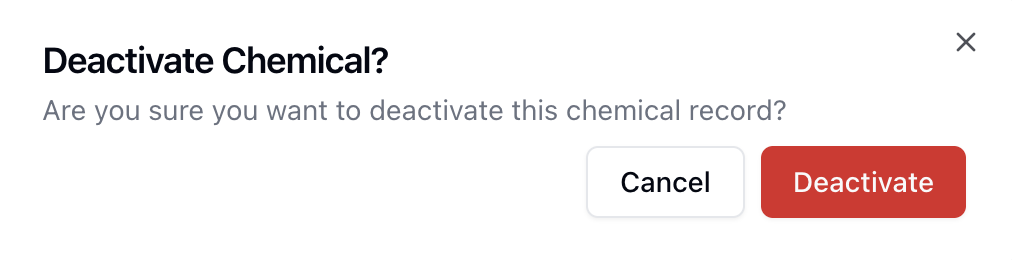 After clicking the Deactivate button, a popup appear to confirm the action. To move forward with deactivating a chemical, click the Deactivate button once more. Otherwise, clicking Cancel returns to the previous screen.
