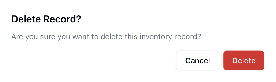 Selecting Delete deletes the chemical inventory record. (To do: When deleting chemical inventory, is it removed from the system or does it show as deleted?)