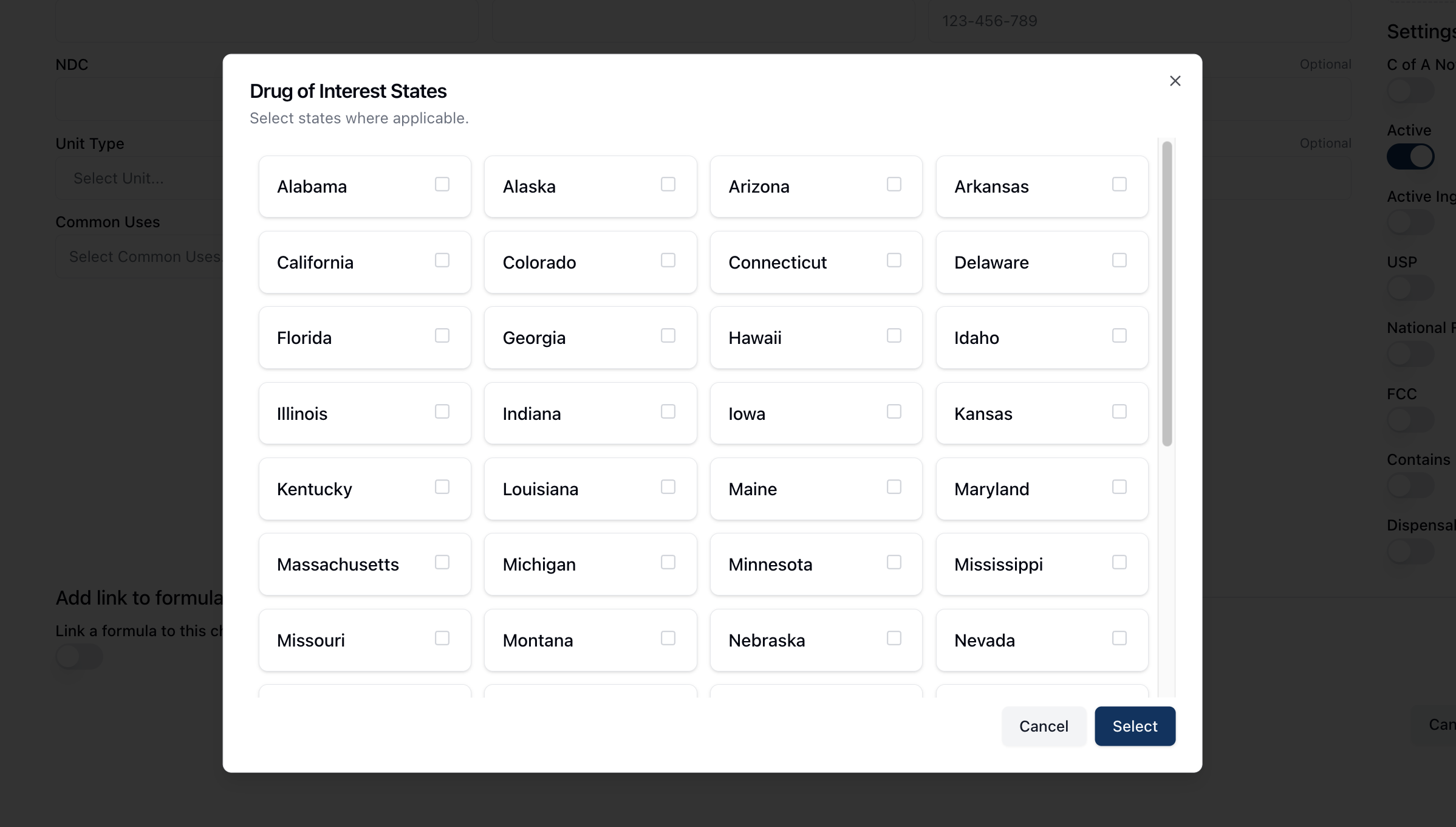 The chemical Schedule displays a dropdown list of available options. To the right of the Schedule field is a Drug of Interest button, which opens a popup allowing you to select the states in which the chemical is a drug of interest. (To do: I think the UI is pretty clear on this, but just confirming this is the correct interpretation.)