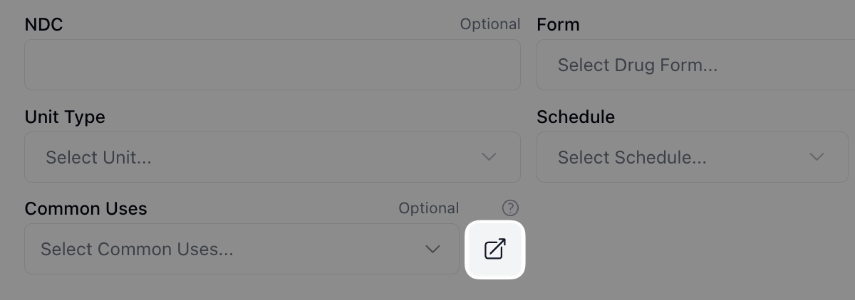 Fields such as Form and Common Uses display a set list of options in a dropdown menu. To manage which options are available, visit the Pharmacy Settings page or click the icon to the right of the field. For more information on managing these options, visit Pharmacy Settings.