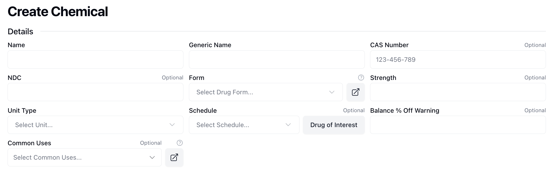 Enter the chemical's basic information into the Details section on the Create Chemical form. Note that all fields are required unless marked as optional.