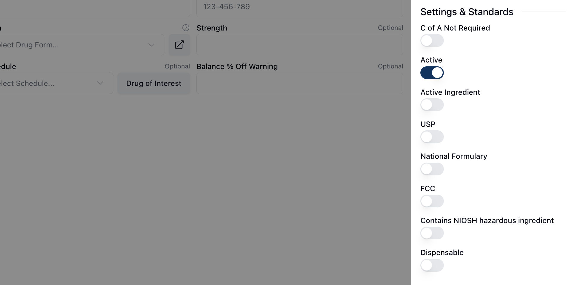 Toggle on any relevant settings under Settings & Standards in the right sidebar. Note that toggling on Contains NIOSH hazardous ingredient displays a badge next to the chemical name on the related record.