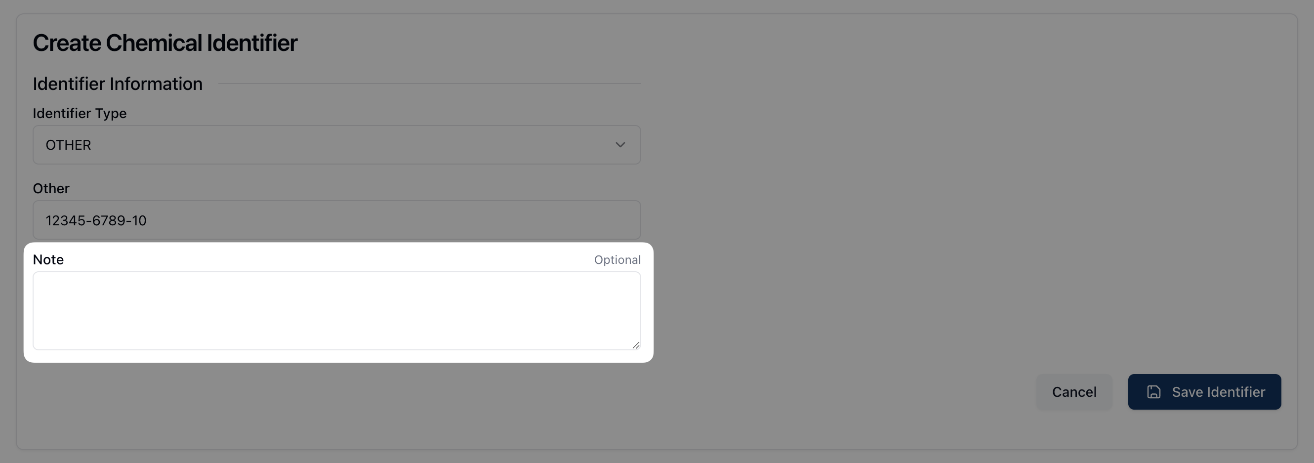 Navigate to the Identifiers tab from the relevant chemical record and click + Add Identifier.