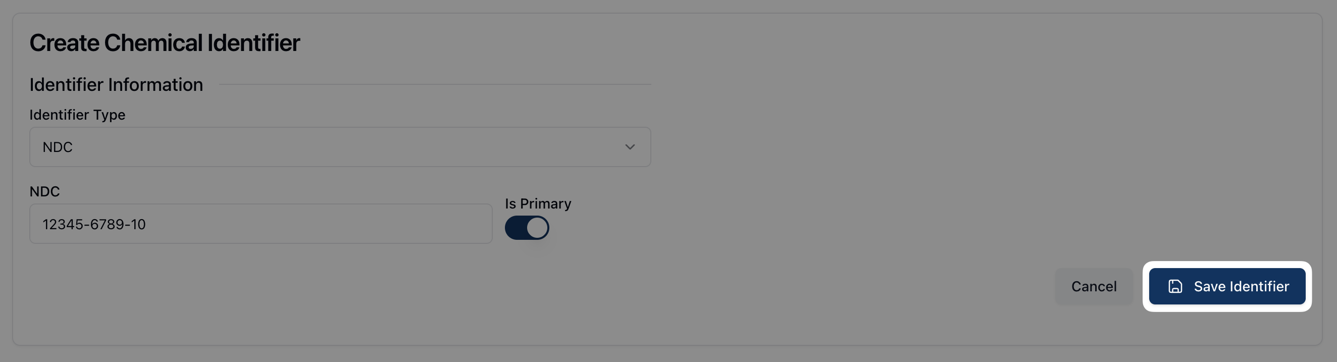If the chemical identifier is the primary identifier, toggle on the button below Is Primary.