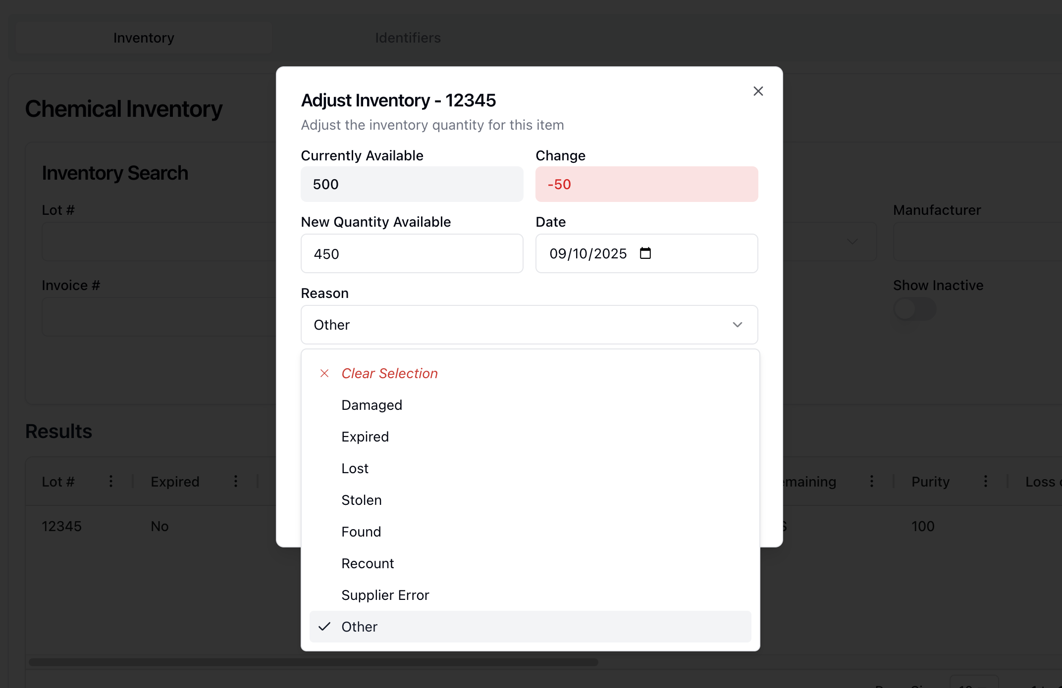 Click the actions menu ( ⠇) next to the relevant chemical inventory record in the Results table and select Adjust Inventory from the dropdown menu that appears.