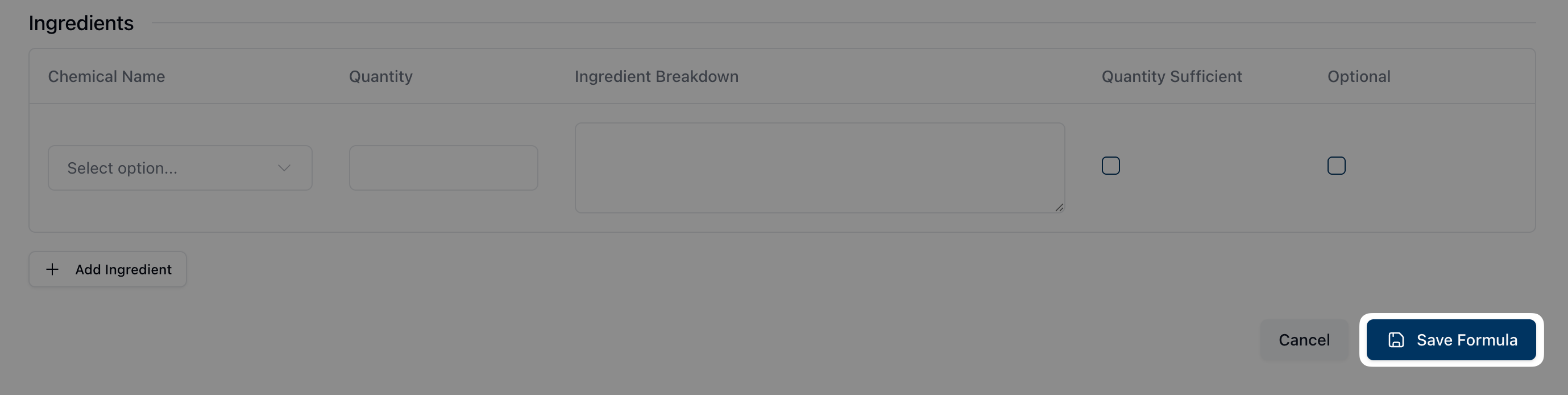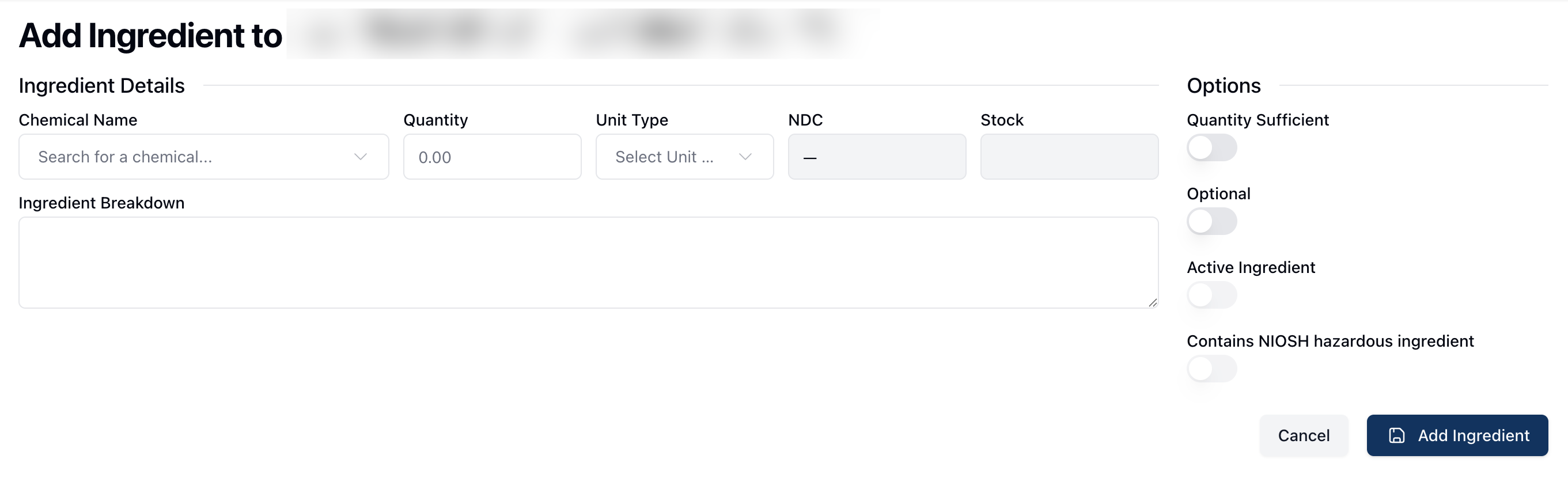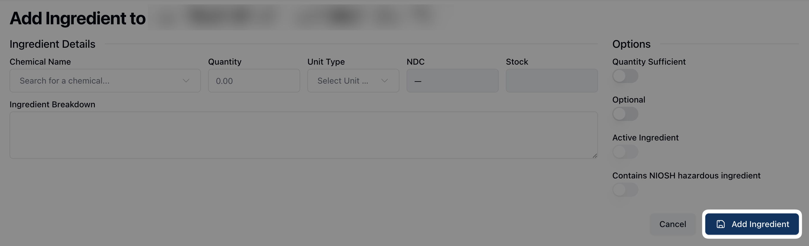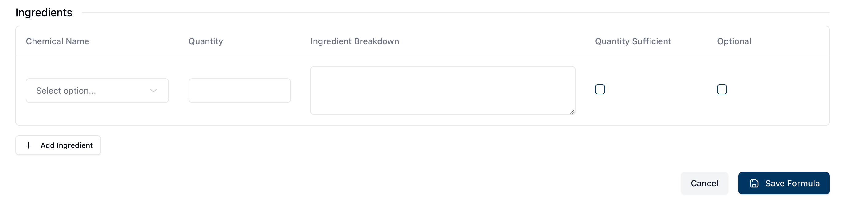 You may add a new ingredient to the formula by clicking on the + Add Ingredient button. Once selected, the Add Ingredient form appears.