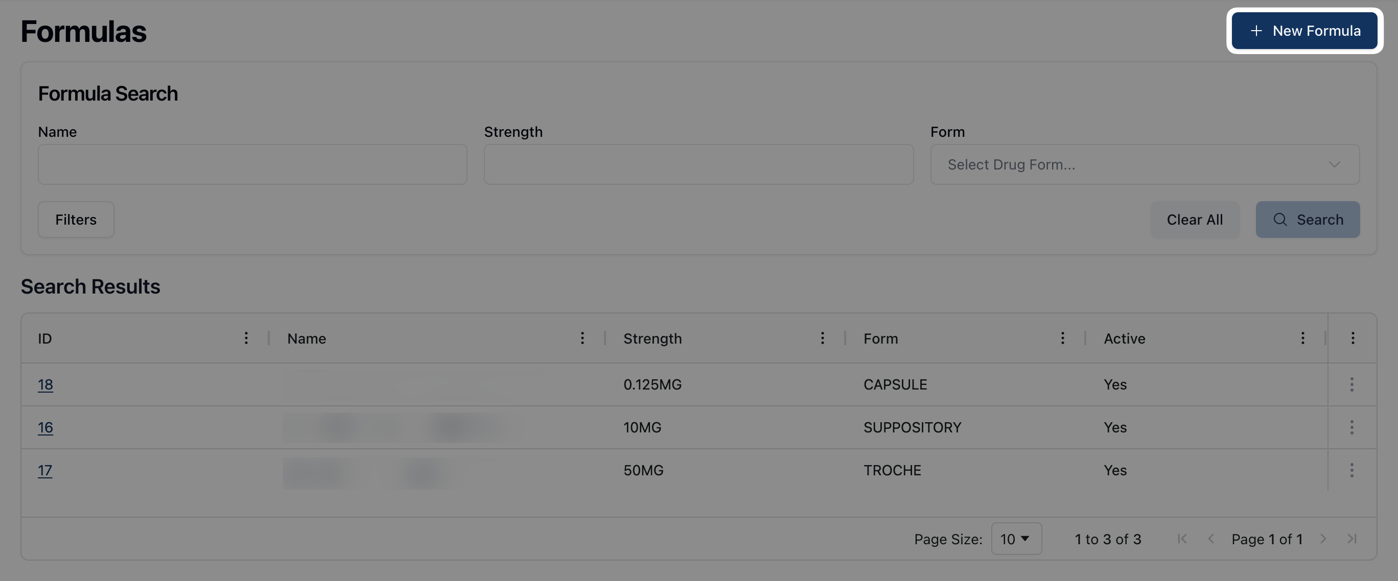 The Formulas page allows you to view, modify, and manage all formulas in the app. Via this page, you can view and modify existing formulas, add new formulas, and manage formula inventory.
