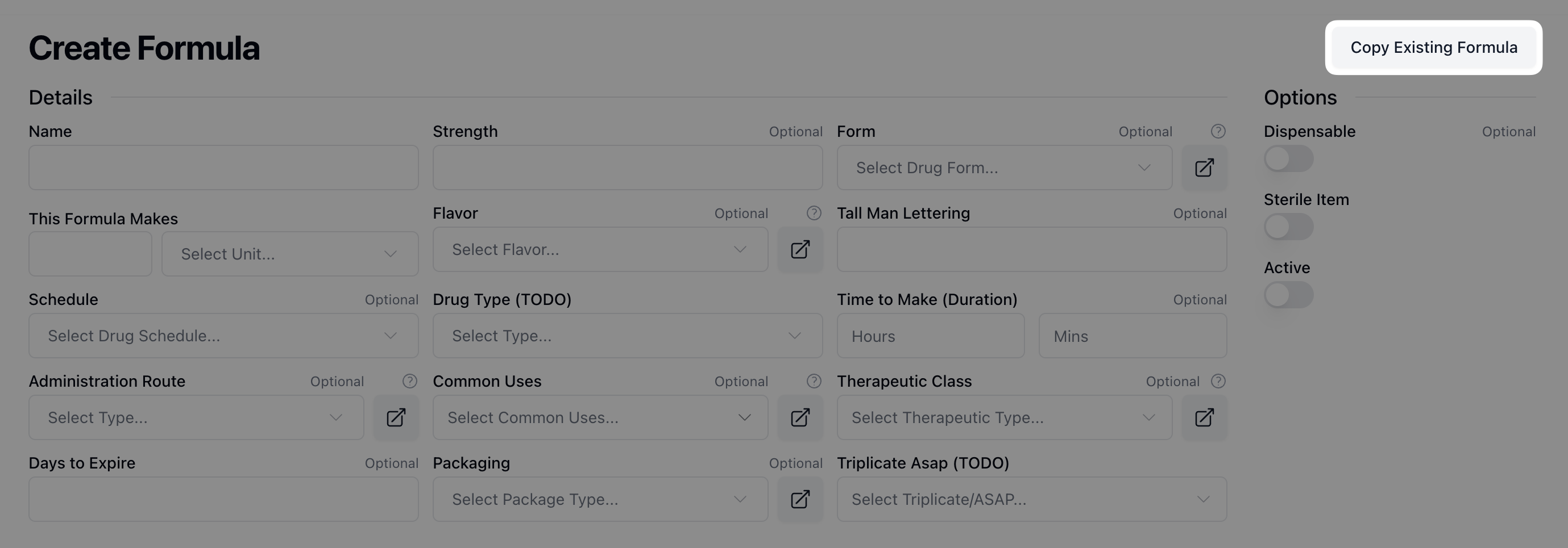 If the formula already exists elsewhere in the system, or if the formula you're creating is similar to another formula, the Copy Formula button allows you to search and prepopulate the form based on an existing formula record.
