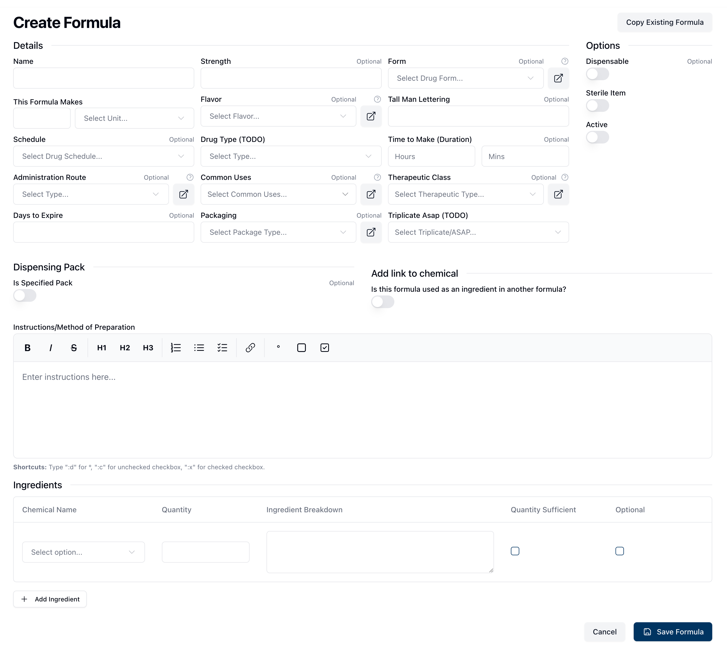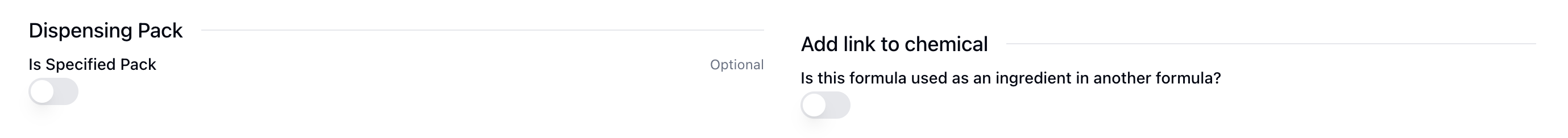 When entering a new formula, you may also toggle on Is Specified Pack if the formula has a specified Dispensing Pack. Additionally, if this formula creates a subformula - or a formula used as an ingredient in another formula - toggle the button under Add link to chemical. This attaches a chemical ID to the subformula, allowing you to add it as an ingredient to other formulas in the future. (To do: Does this mean the type of drug form this formula produces is a specific output, or a different type of pack? Also confirm usage of subformula/accuracy.)