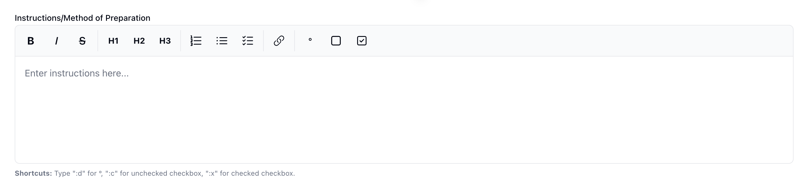 While the field is editable, you may directly edit, delete, or update any of the text visible. As a reminder, the Ingredients/Method of Preparation field includes rich text formatting, using the formatting toolbar, as described in Adding a new formula.