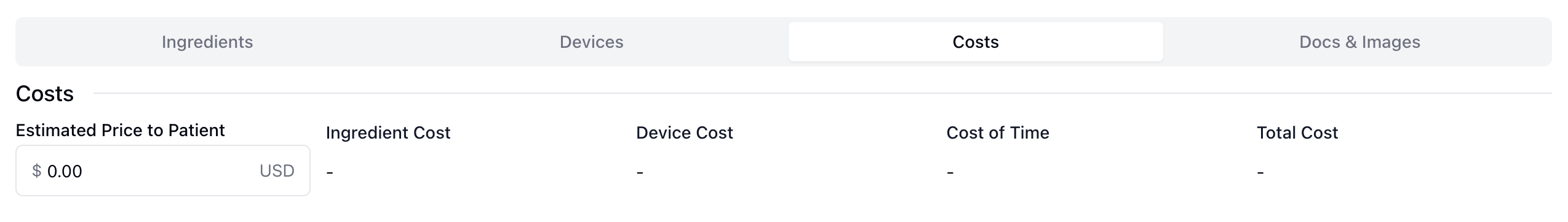 Once you've verified all ingredients and devices, navigating to the Costs tab allows you to modify and view information related to the formula lot, such as the total cost and inventory control. On this tab, the cost of ingredients, devices, and time determine the Total Cost, which is filled automatically. (To do: Review once complete.)