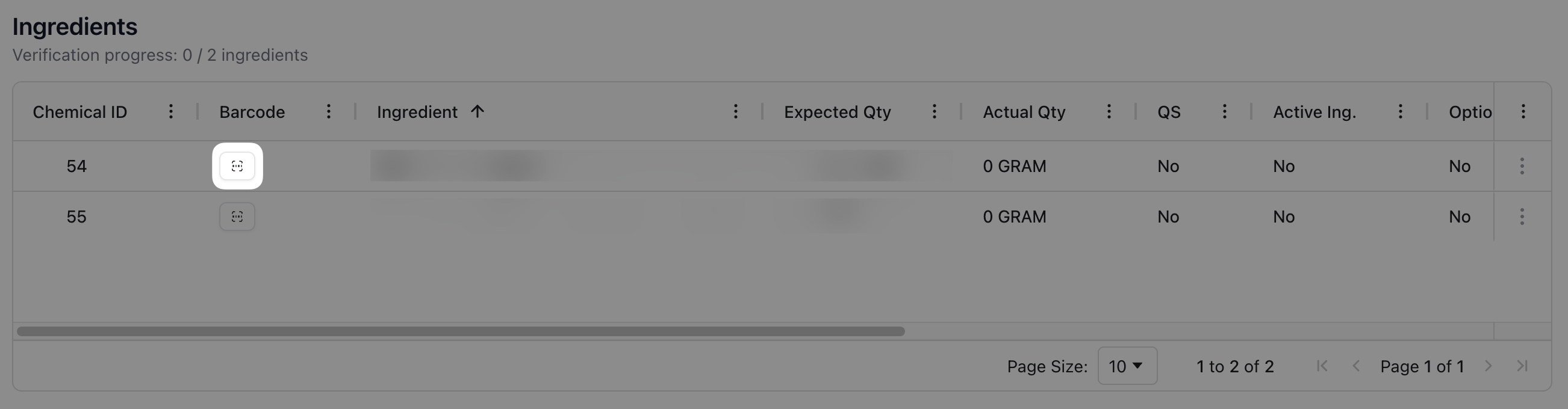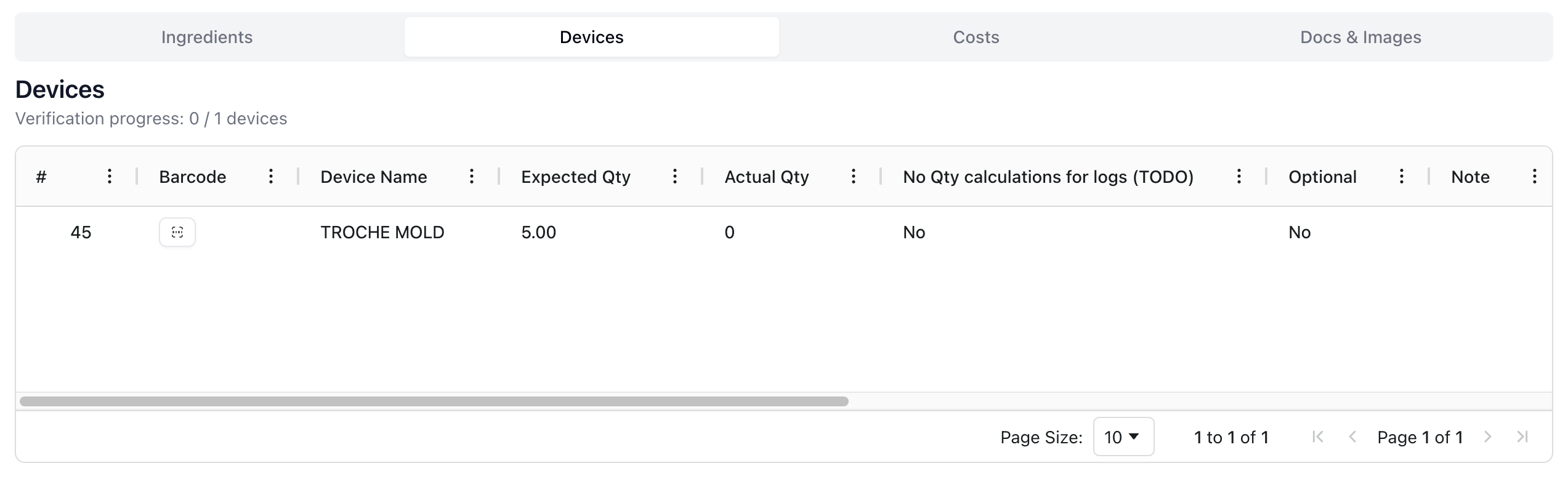 To verify the formula devices, click the Devices tab. Similar to the Ingredients tab, you must verify each device. Click the barcode icon to open the Device Barcode Verification popup, which includes basic information about the device, such as the name and relevant ID number.