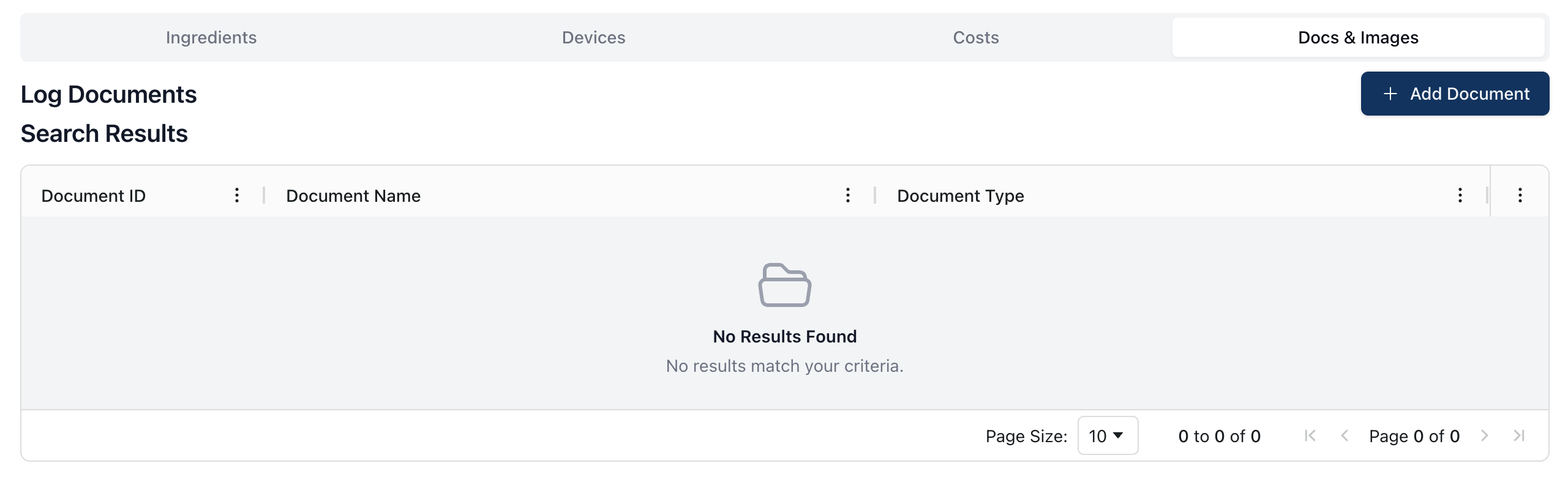 Finally, you can upload any relevant documents or images via the Docs & Images tab. Log Documents appear in a table view, including the document ID, name, and type. (To do: Review pending clarification on the types of documents and images that may be stored here.)
