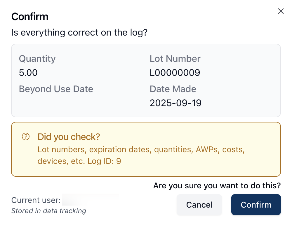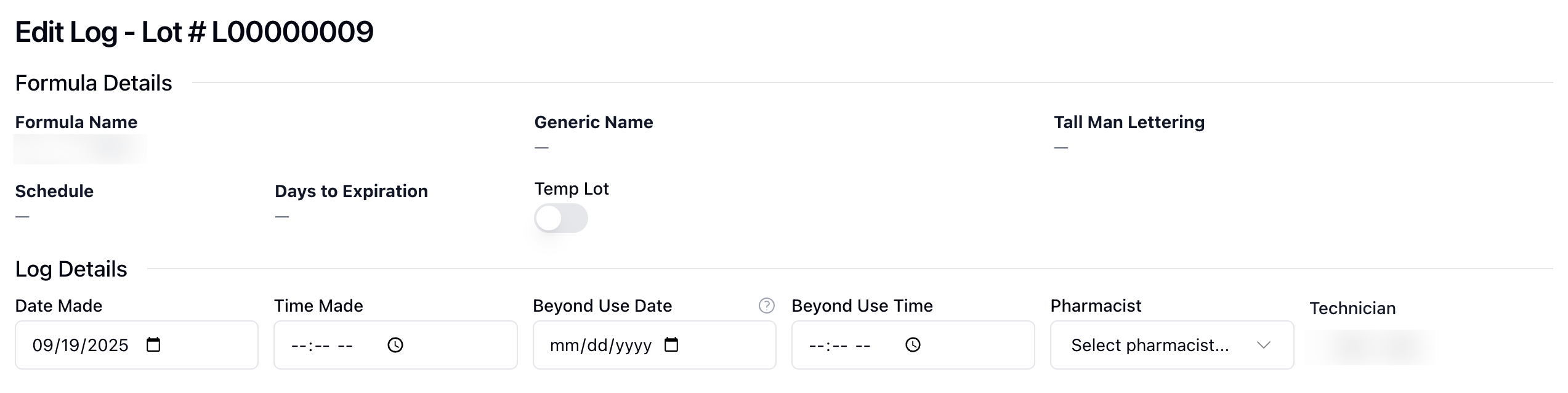 All information related to the specific log entry appears in the Log Details section. This includes the date made and the total time to make, automatically filled with the value calculated by the page's running timer. (To do: Confirm it is automatically filled.) Under Beyond Use Date and Beyond Use Time, enter the date and time that the formula lot expires to calculate the full expiration date.