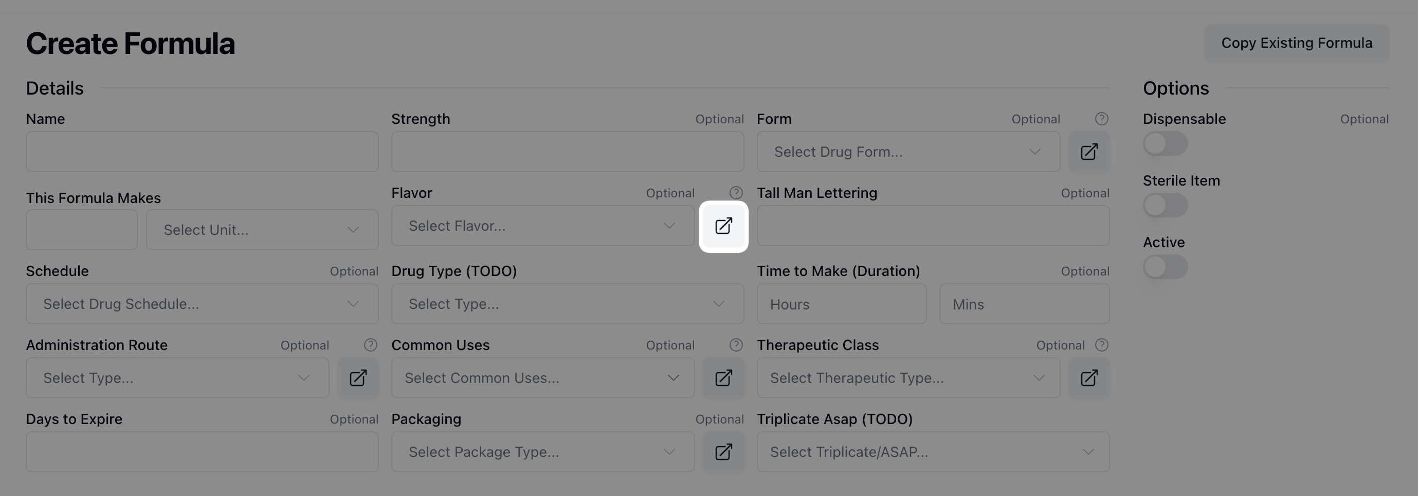 Note that a handful of fields provide choices via a dropdown list, such as Form and Flavor. You can manage the options that appear in these lists via the Pharmacy Settings page or by clicking on the icon to the right of the field.