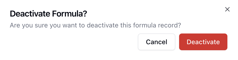 After clicking the Deactivate button, a popup appears to confirm the action. To move forward with deactivating a formula, click the Deactivate button once more. Otherwise, click Cancel to return to the previous screen.