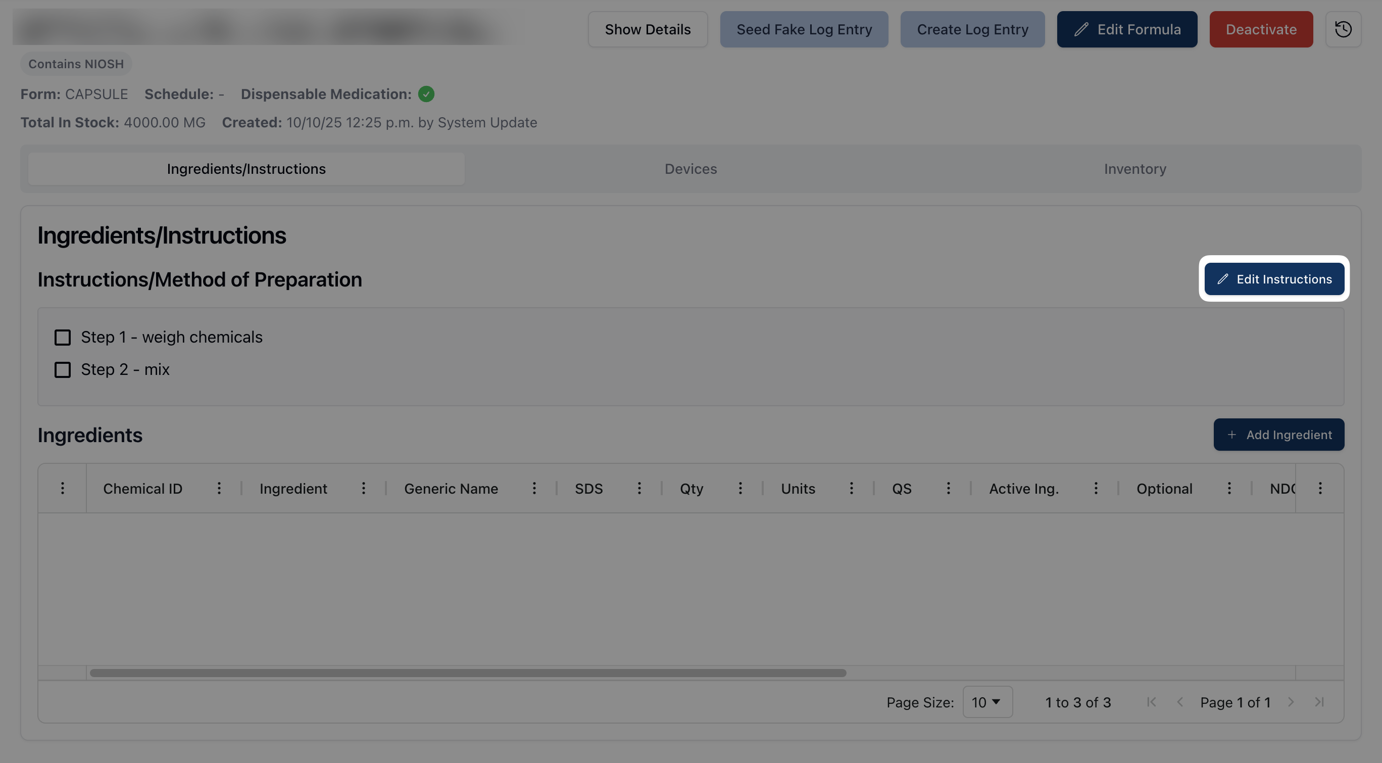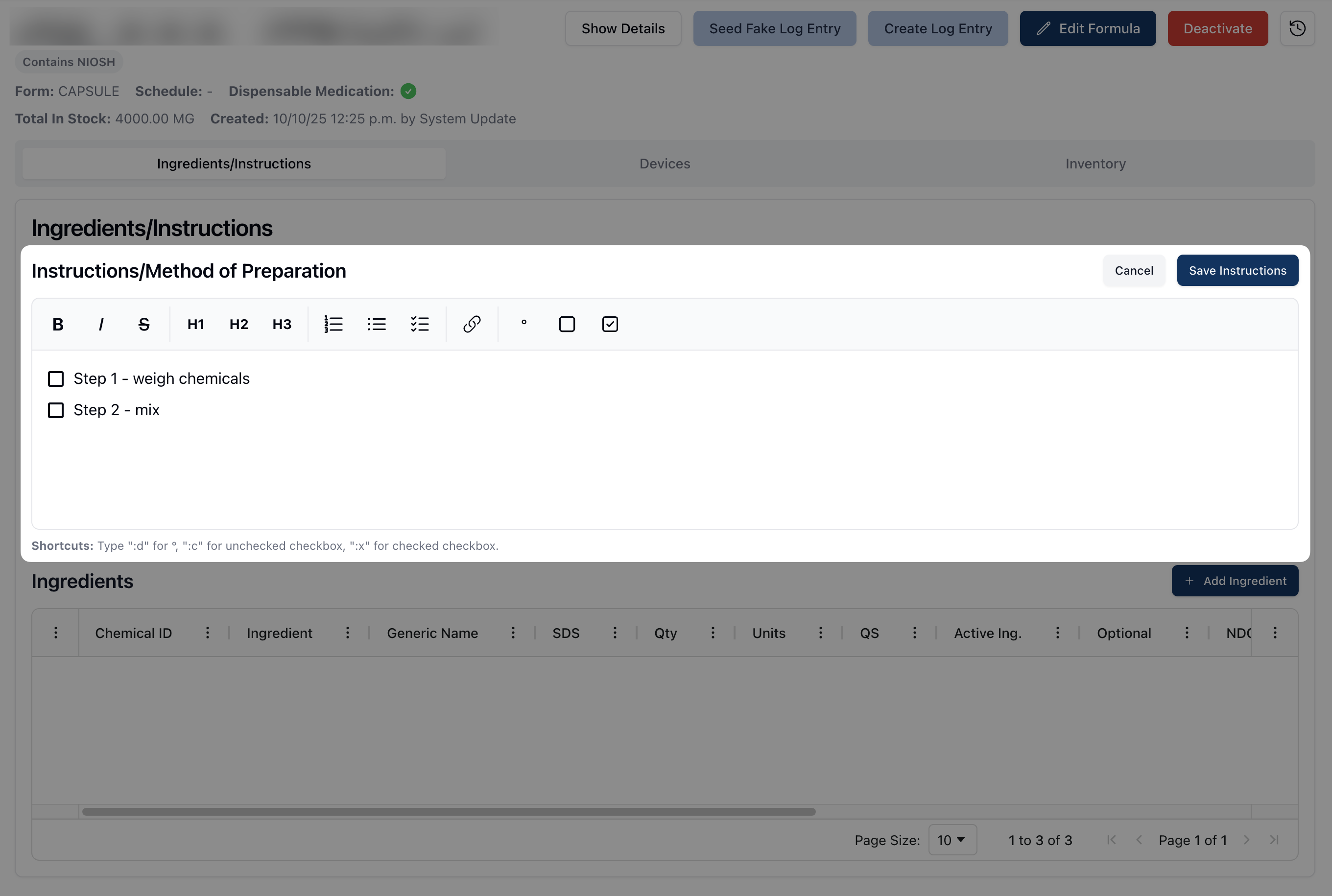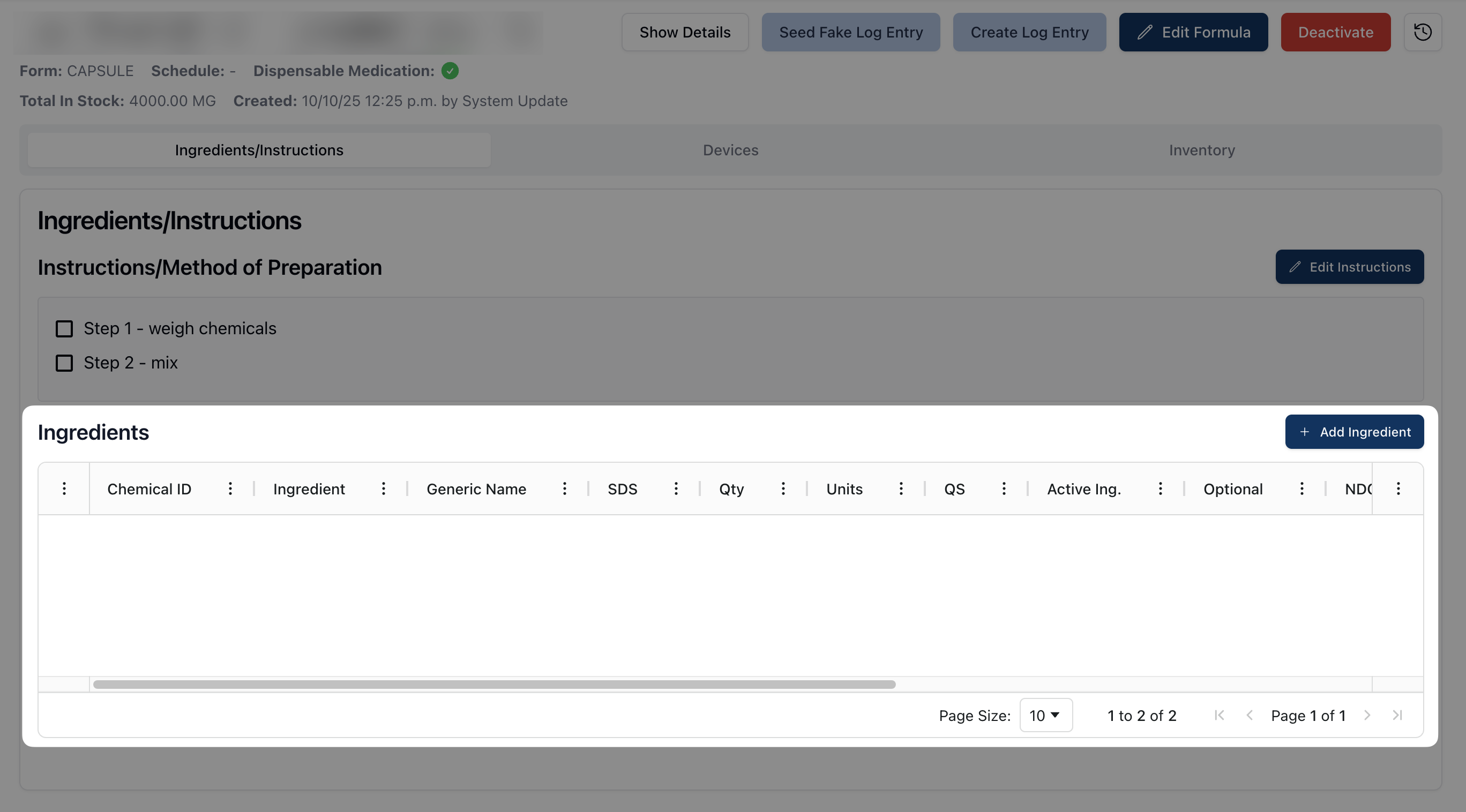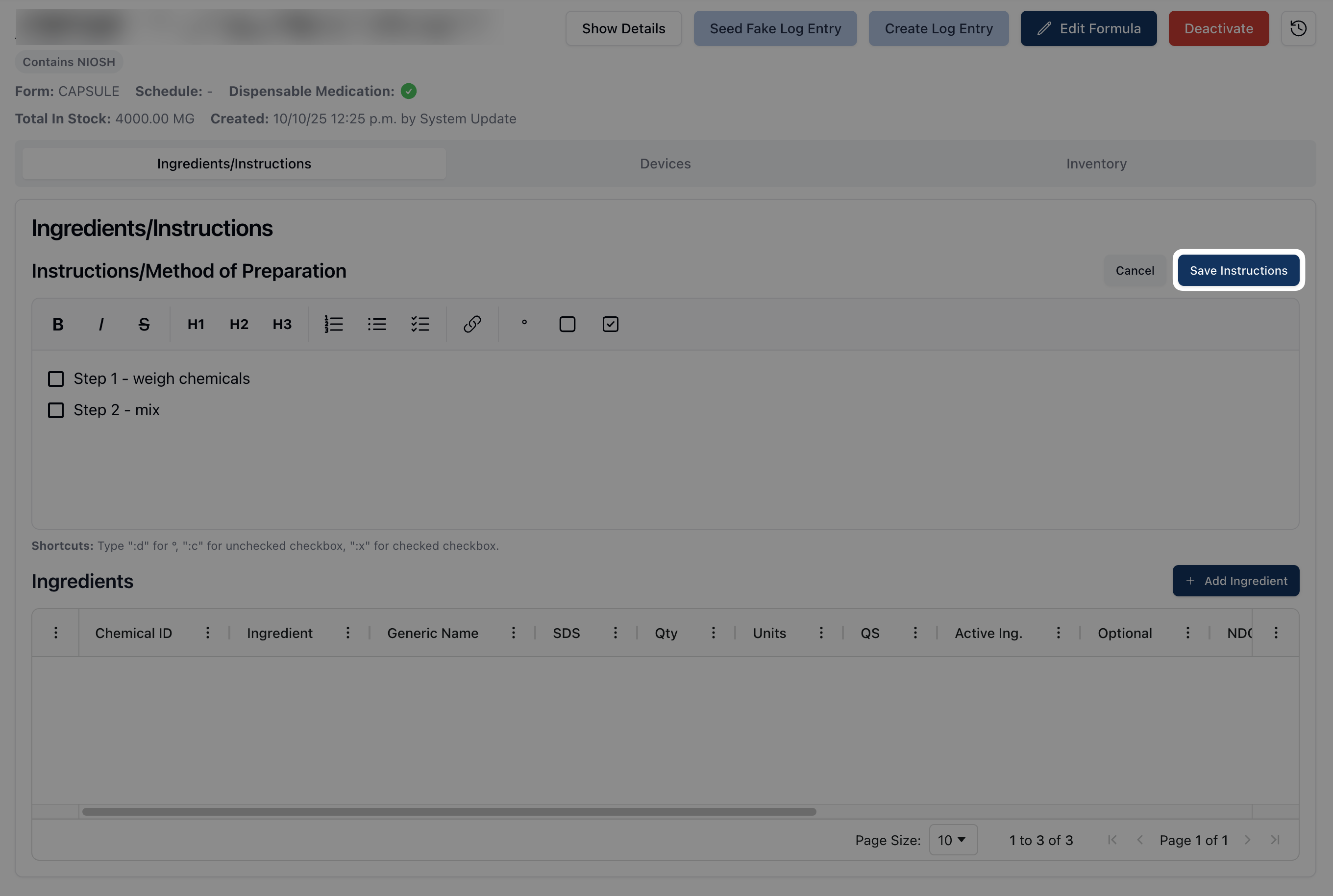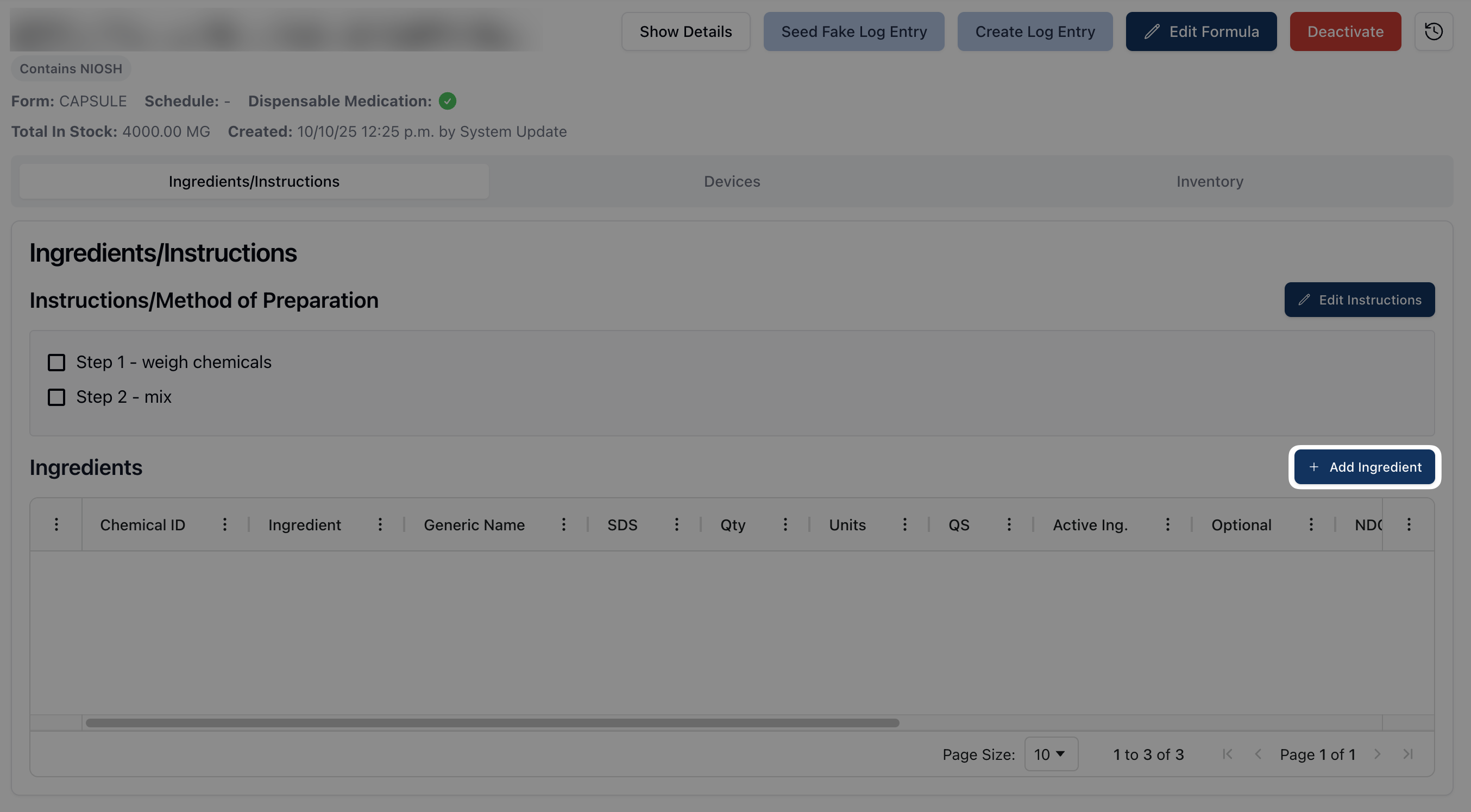 Once you have added the formula instructions, you can add ingredients under the Ingredients section.