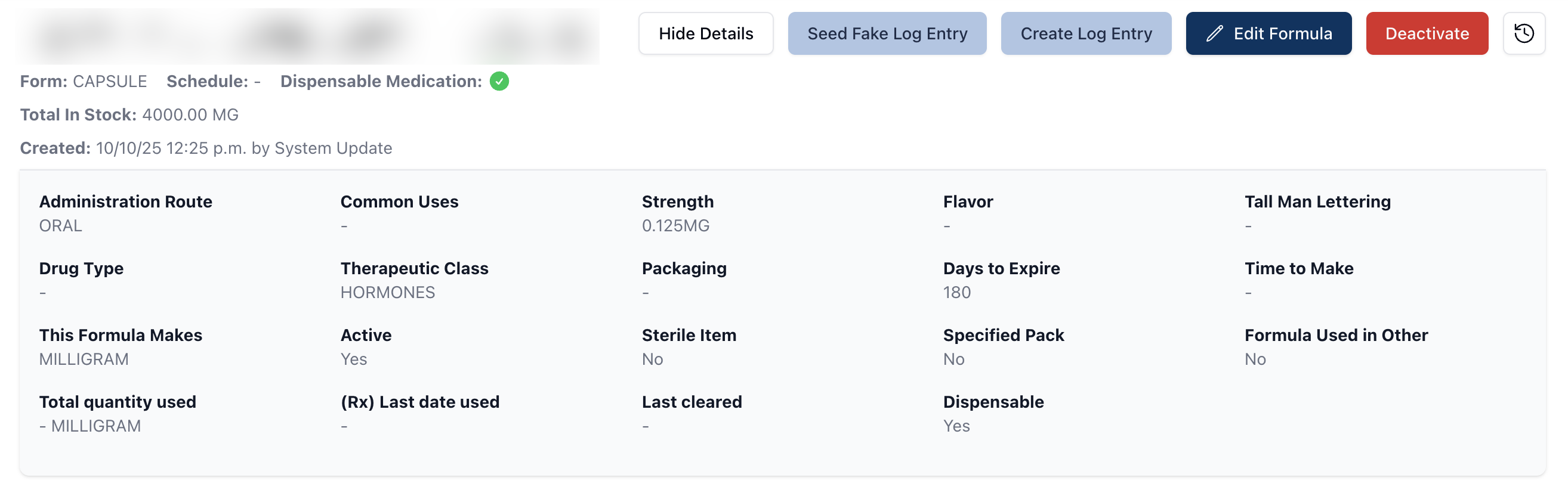 The Inventory tab displays all inventory for a formula. Compounded formula lots, or batches, determine inventory and can be added by creating a new formula log entry.