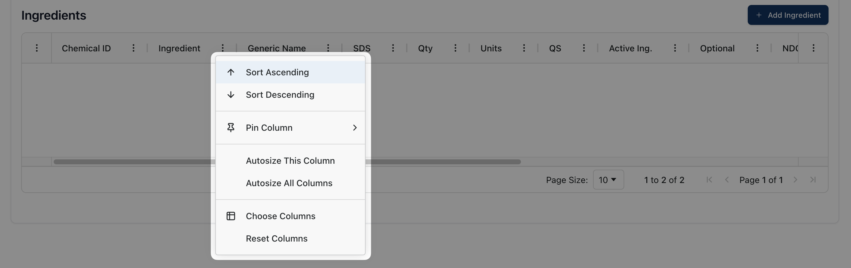 You can sort ingredients according to the categories listed at the top of the table by clicking on the three dots ( ⠇) to the right of each column title, as described in Table options and sorting.