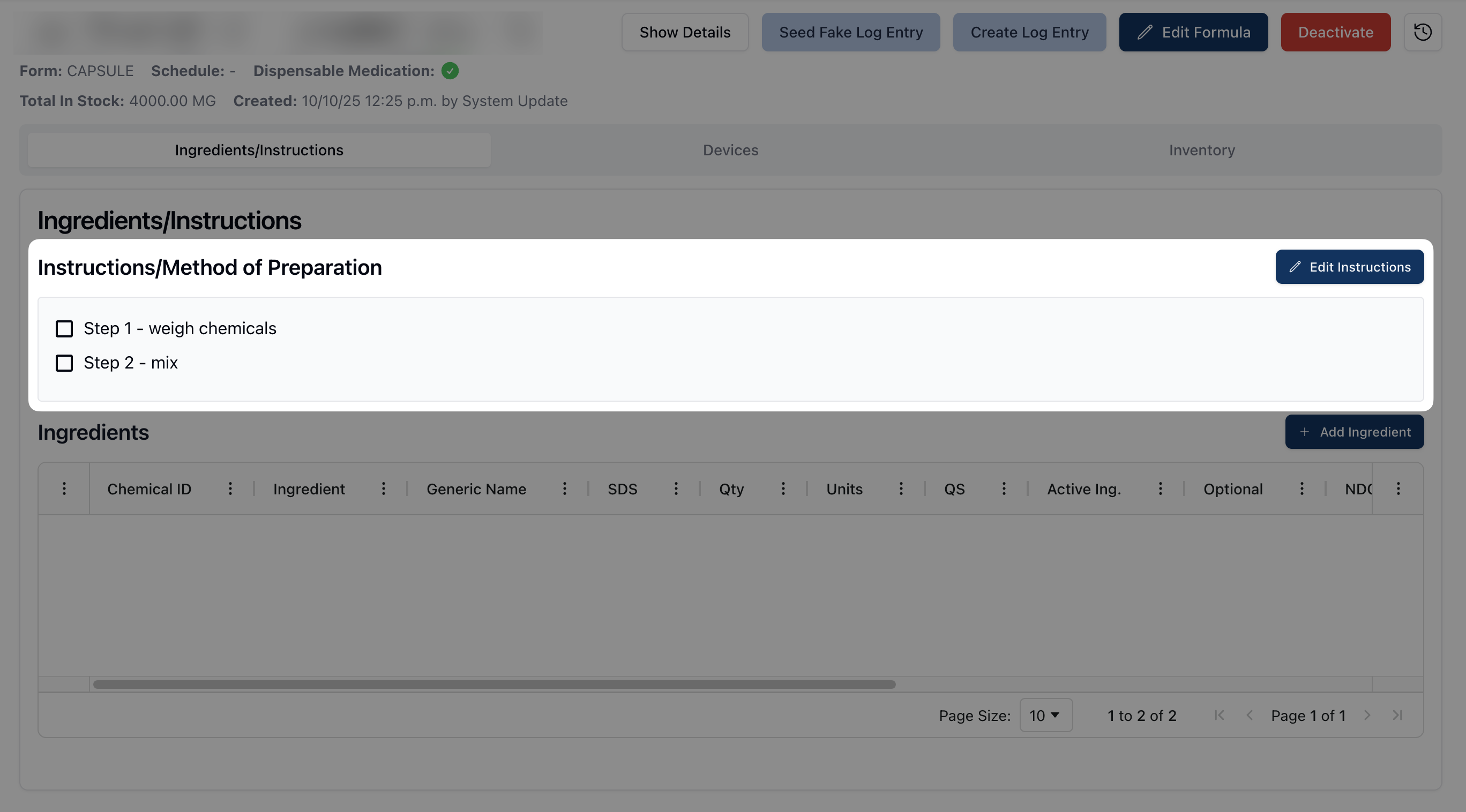 The Instructions/Method of Preparation section displays the written instructions for creating the formula in a scrollable text field. Below, the Ingredients table displays the list of ingredients used in the formula.