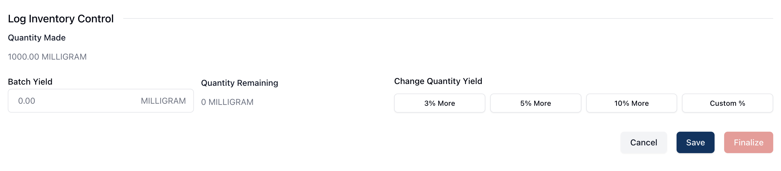The Log Inventory Control section at the bottom of the page includes both expected and actual outputs for the formula log entry. The Quantity Made field is read-only and displays the expected yield for the formula. Under Batch Yield, enter the actual amount made during the process. This information is also used to update the relevant formula inventory. (To do: Review once complete. Pending clarification on the need for "quick action" buttons.)