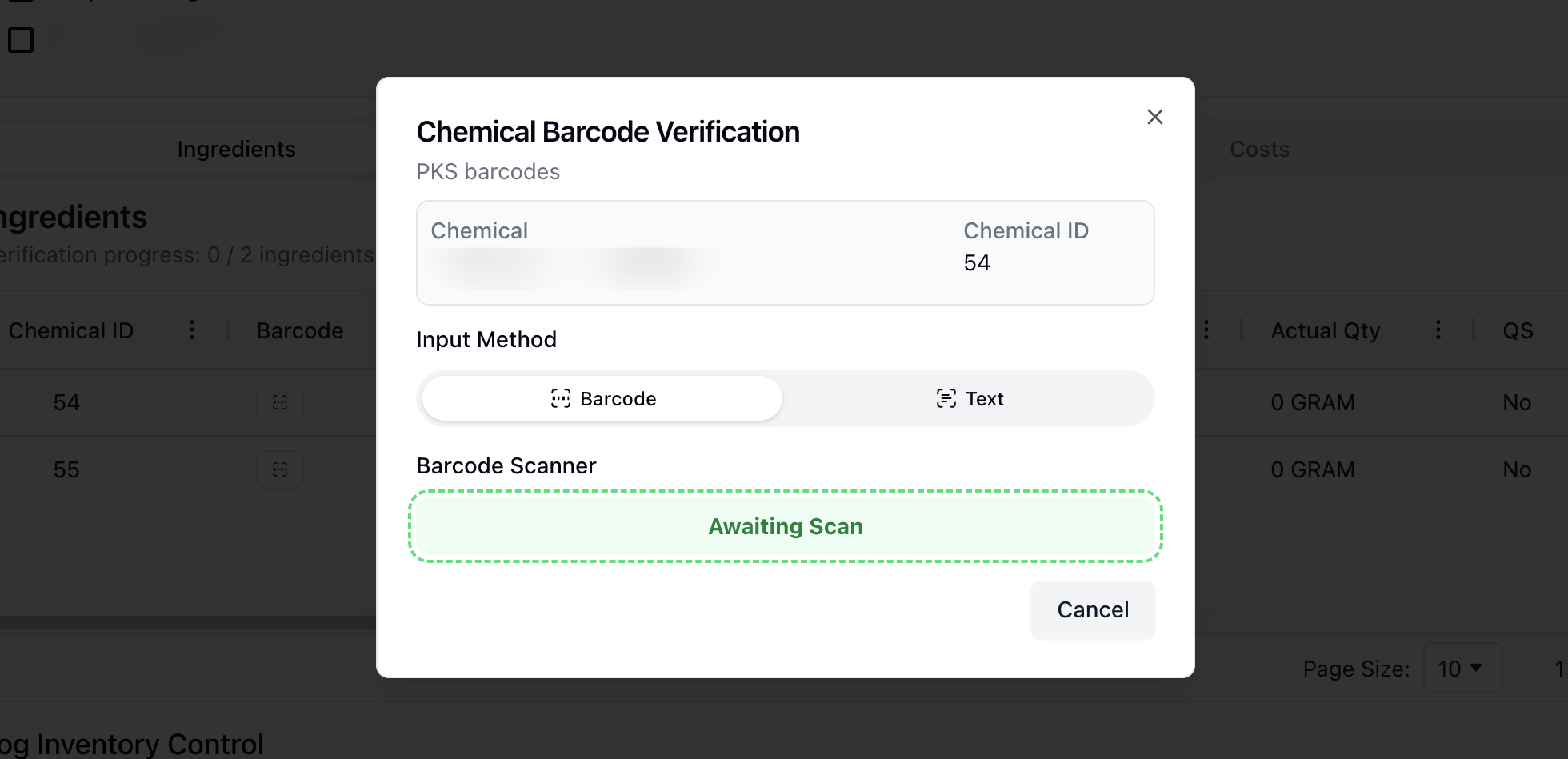 During the formula lot creation process, all ingredients require verification. For each ingredient, click the barcode icon to open the Chemical Barcode Validation popup, which allows you to verify each ingredient. The popup window displays basic information about the chemical, such as the chemical name and ID, as well as an area to enter the relevant chemical inventory information. (To do: Note: This may include photos as well in the future. Check for process updates.)