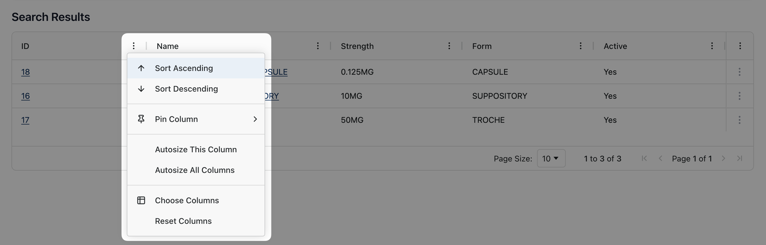 You can sort search results according to the categories listed at the top of the table by clicking on the three dots ( ⠇) to the right of each column title.
