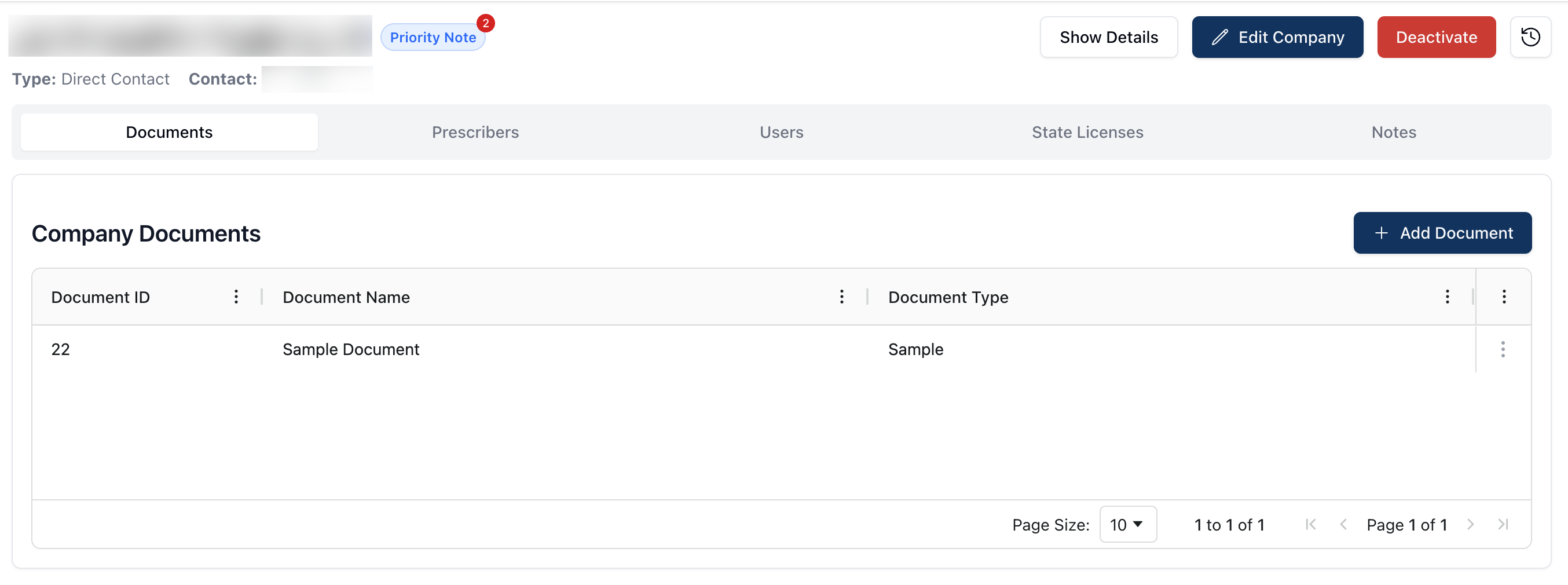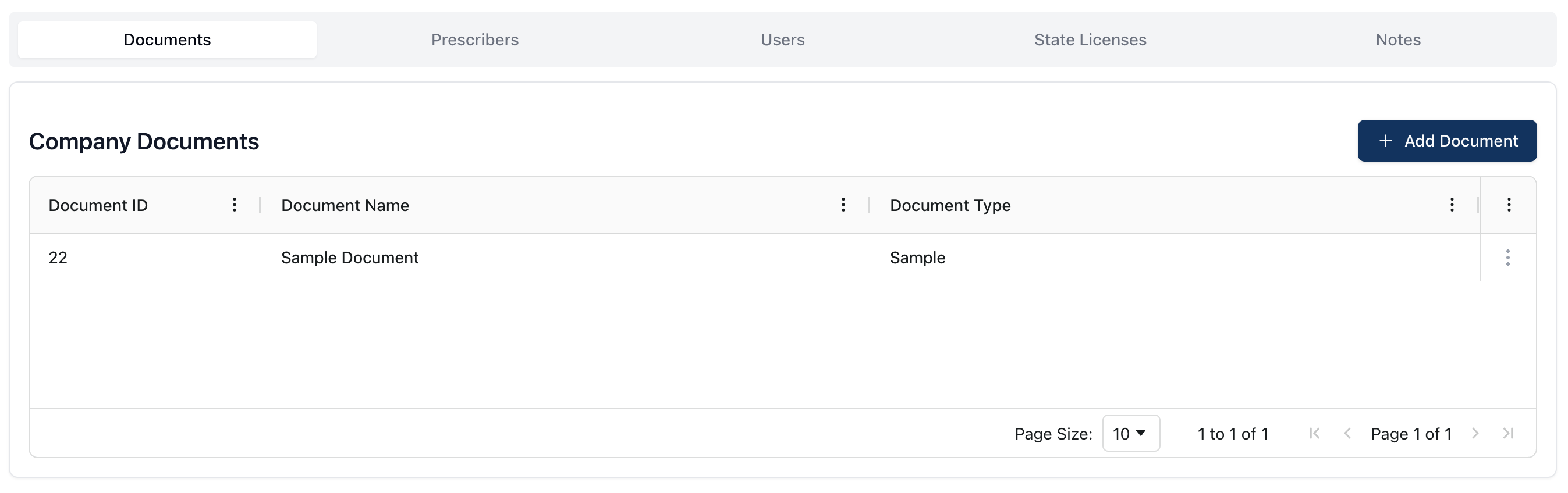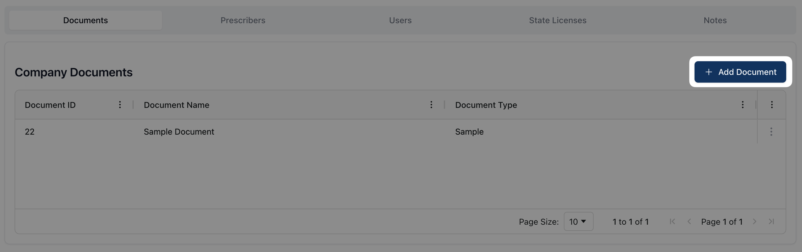 To upload a new document to the company record, click the + Add Document button in the upper right corner.