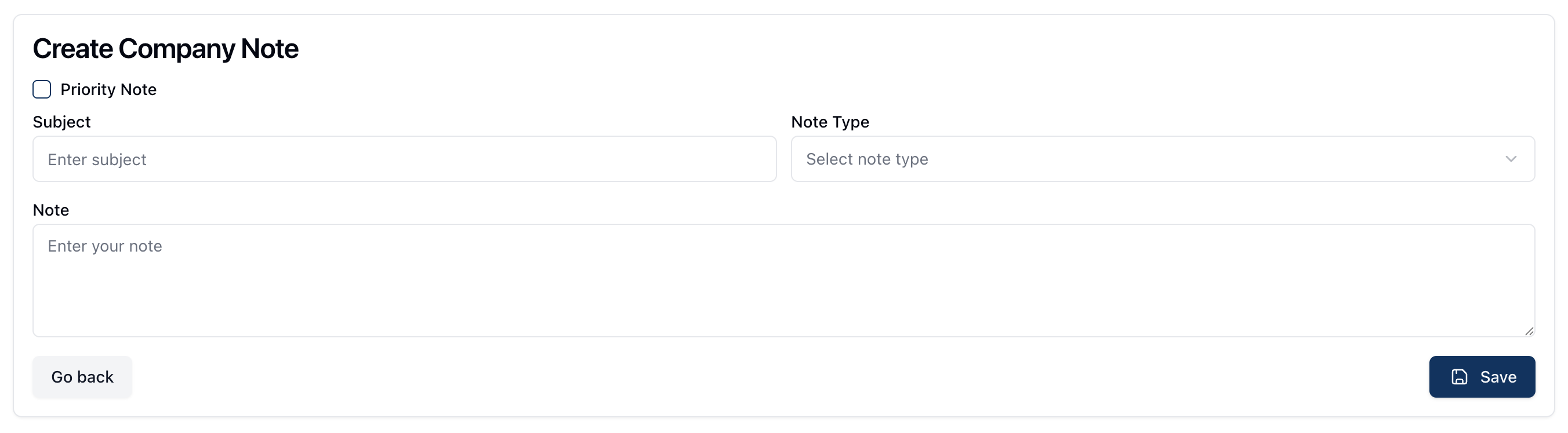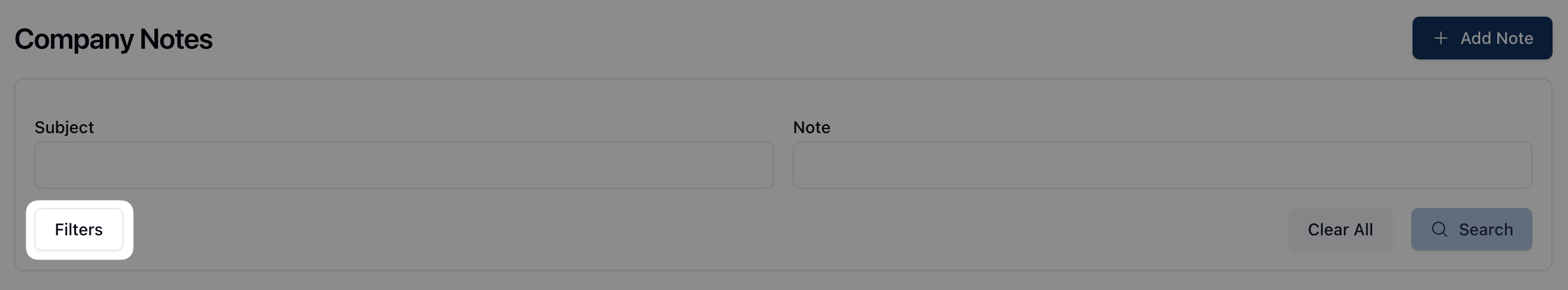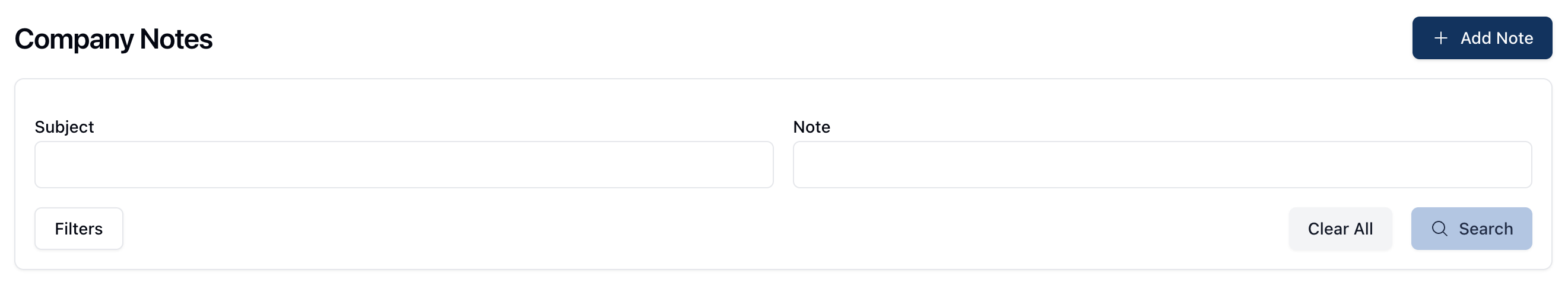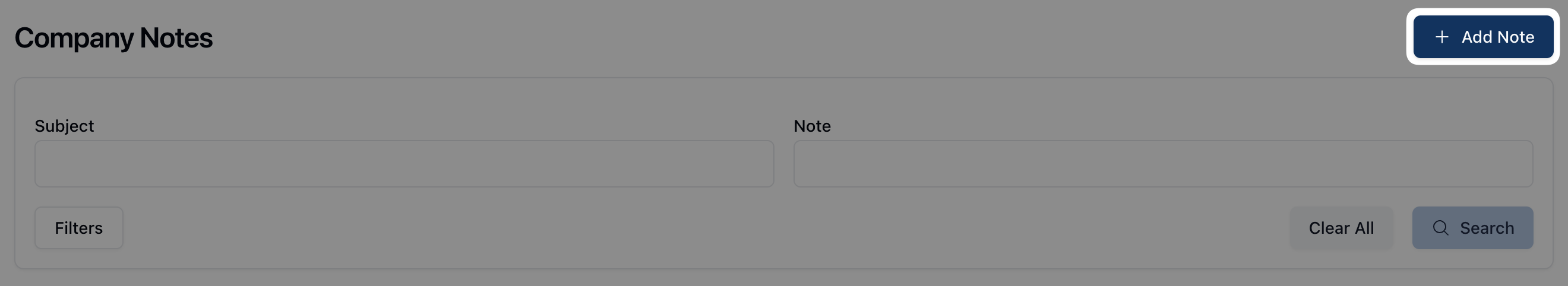 To add a new note to a company record, click the + Add Note button in the upper right corner of the page.