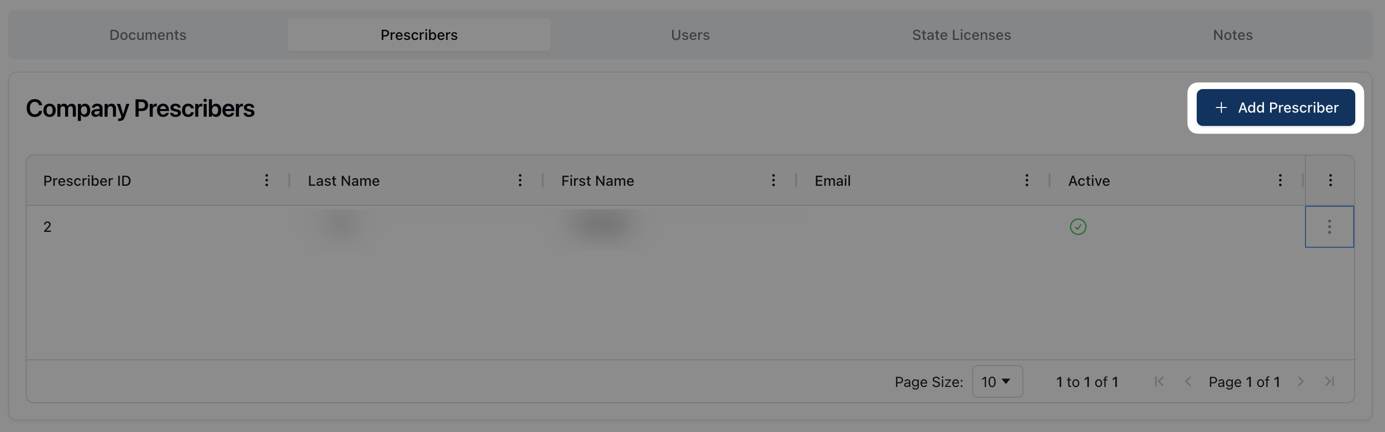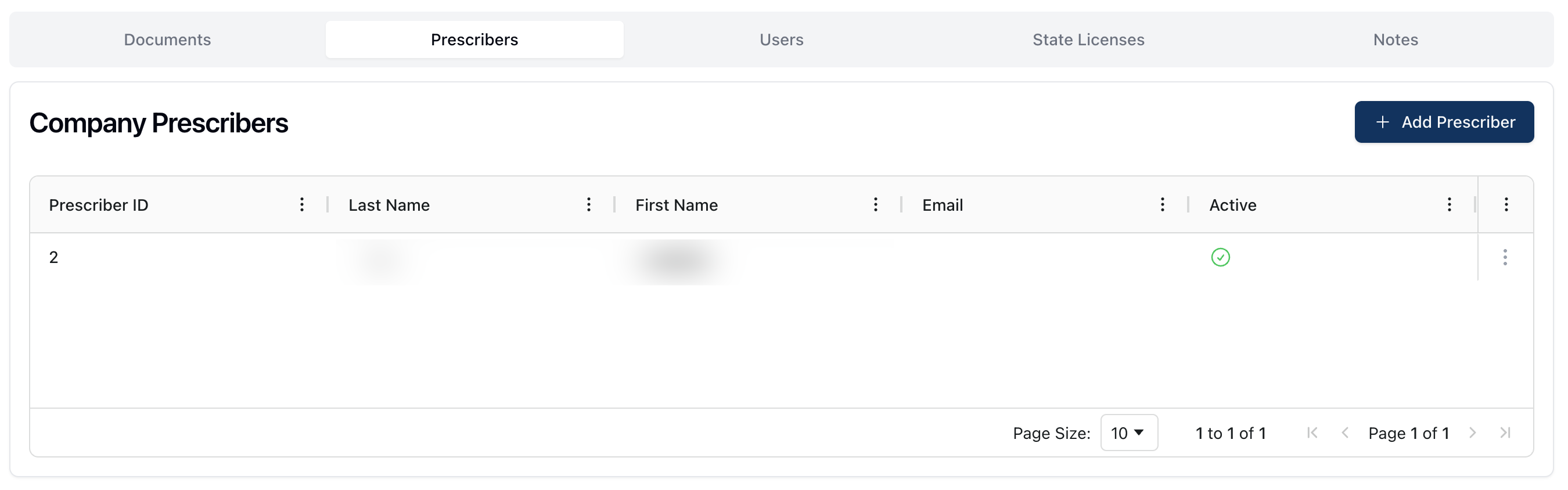 The Company Prescribers table lists all prescribers related to the company, sorted by prescriber ID by default. Each prescriber includes the following information: